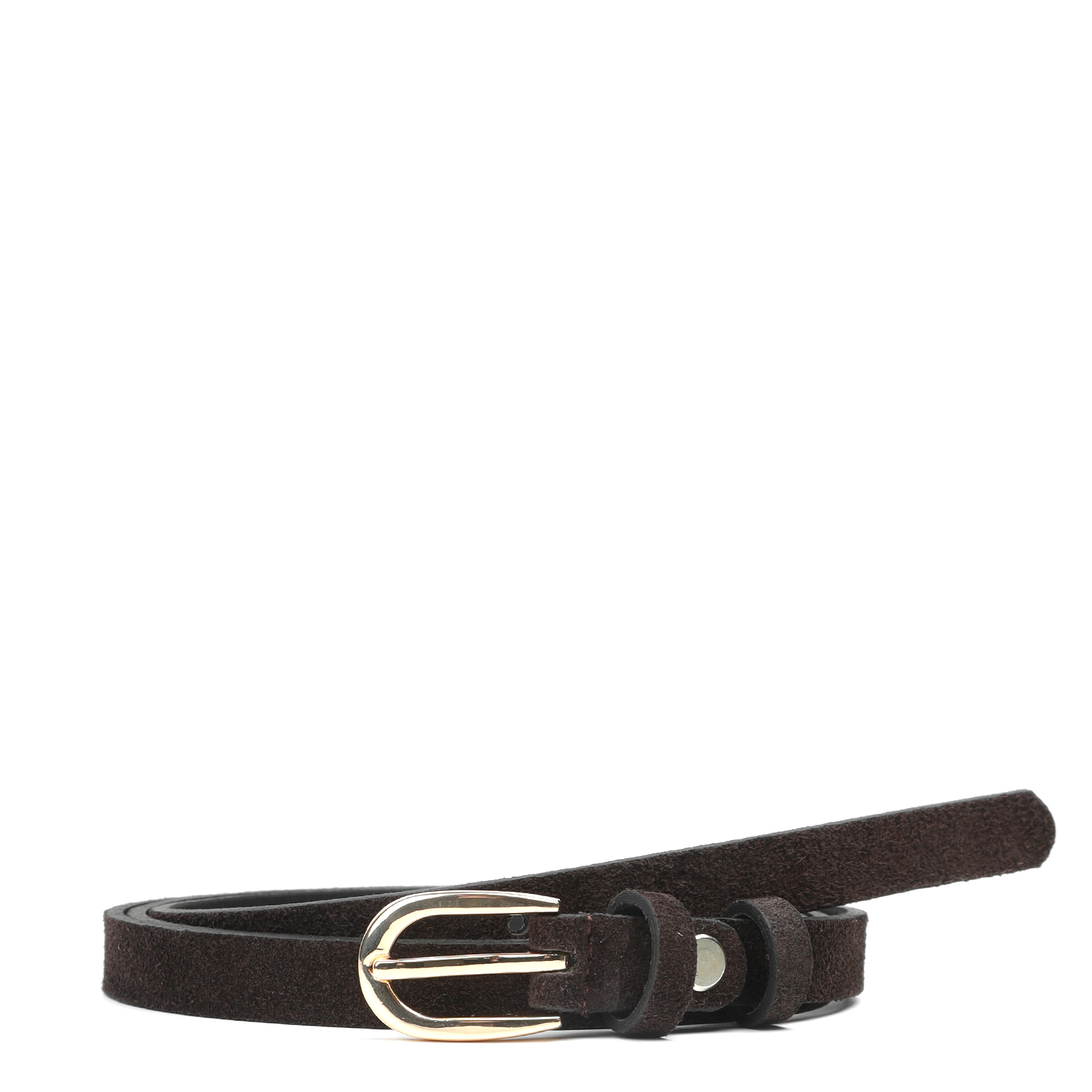 Узкий женский ремень итальянского бренда FABRETTI в темно-коричневом цвете, выполнен из натуральной замши. Тыльная сторона из гладкой натуральной кожи.