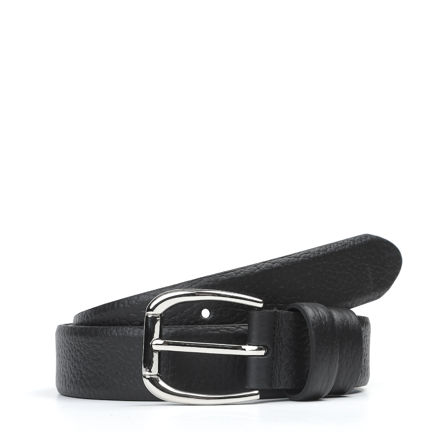 Модель дополнена округлой пряжкой из прочного гальванического сплава с покрытием серебро. Пряжка крепится с помощью винта, что позволяет легко отрегулировать длину. Две шлевки из зернистой кожи в тон изделию: одна закреплена, вторая - подвижная.