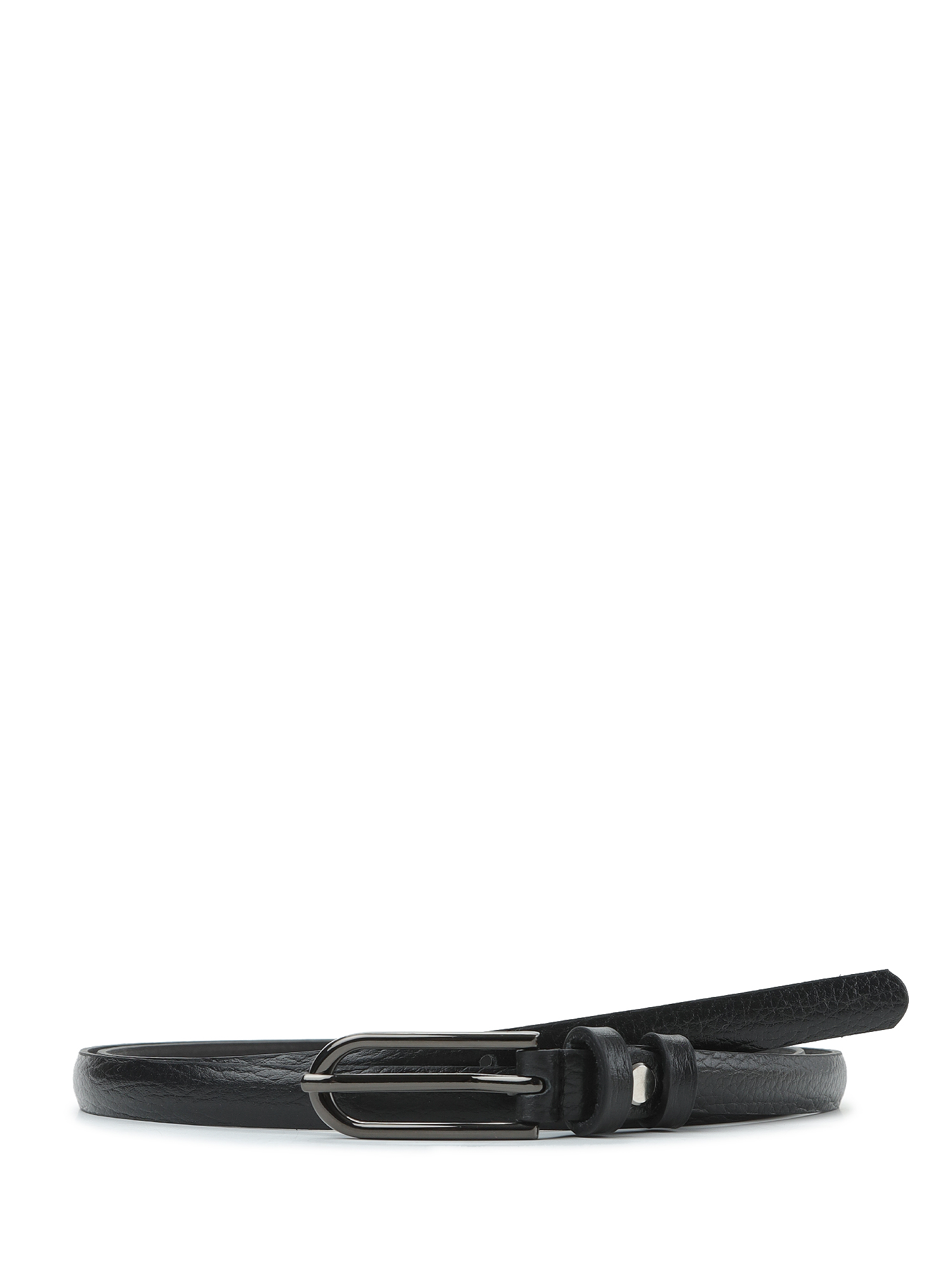 Узкий женский ремень итальянского бренда FABRETTI в классическом черном цвете выполнен из натуральной кожи с крупнозернистой фактурой. Тыльная сторона - из гладкого плотного спила.
