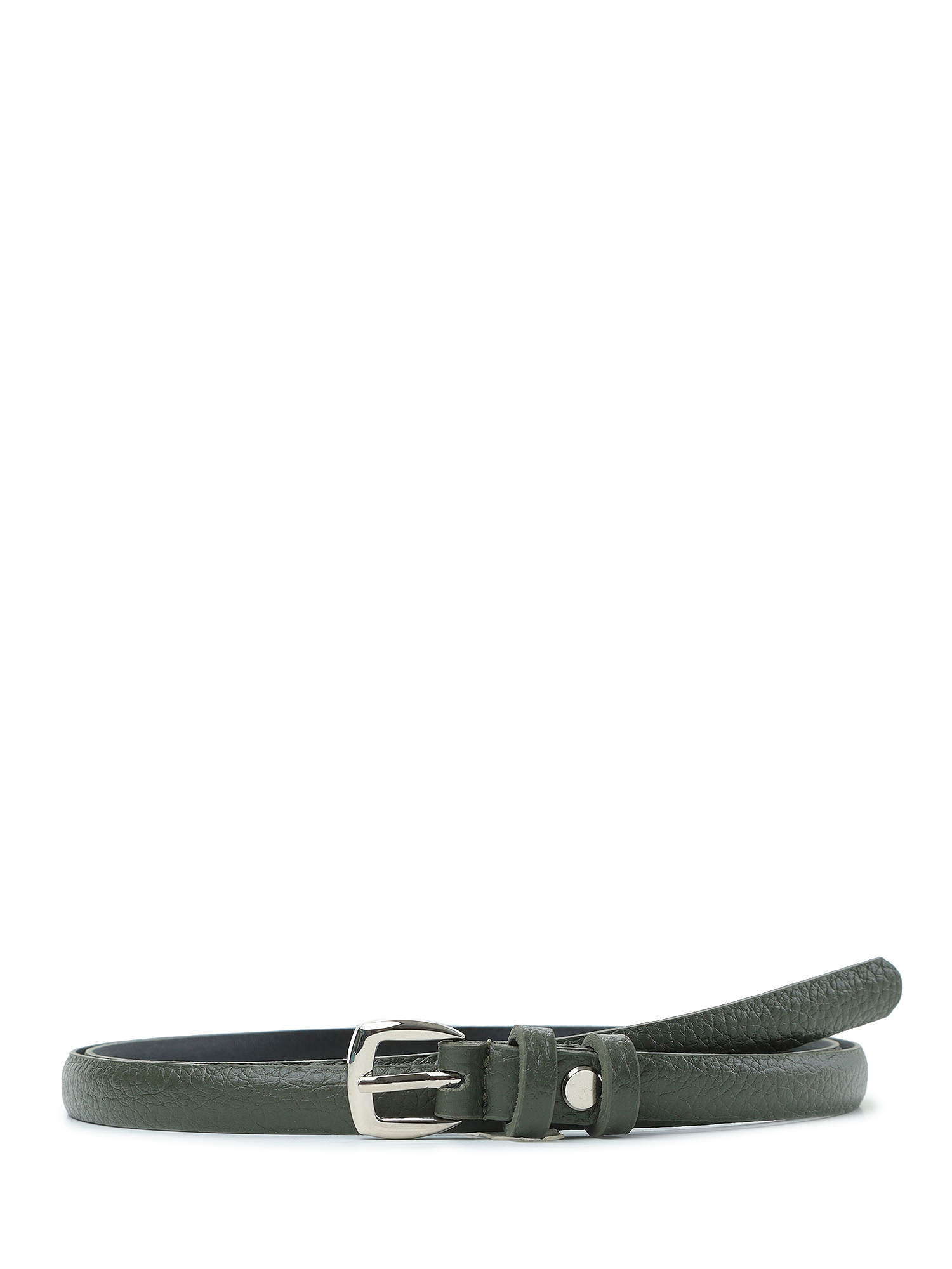 Узкий женский ремень итальянского бренда FABRETTI в необычном темно-зеленом цвете выполнен из натуральной кожи с крупнозернистой фактурой. Тыльная сторона - из гладкого плотного спила.
