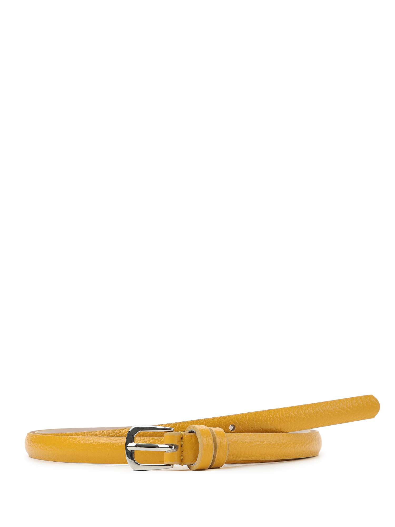 Узкий женский ремень итальянского бренда FABRETTI в солнечном желтом цвете выполнен из натуральной кожи с крупнозернистой фактурой. Тыльная сторона - из гладкого плотного спила.