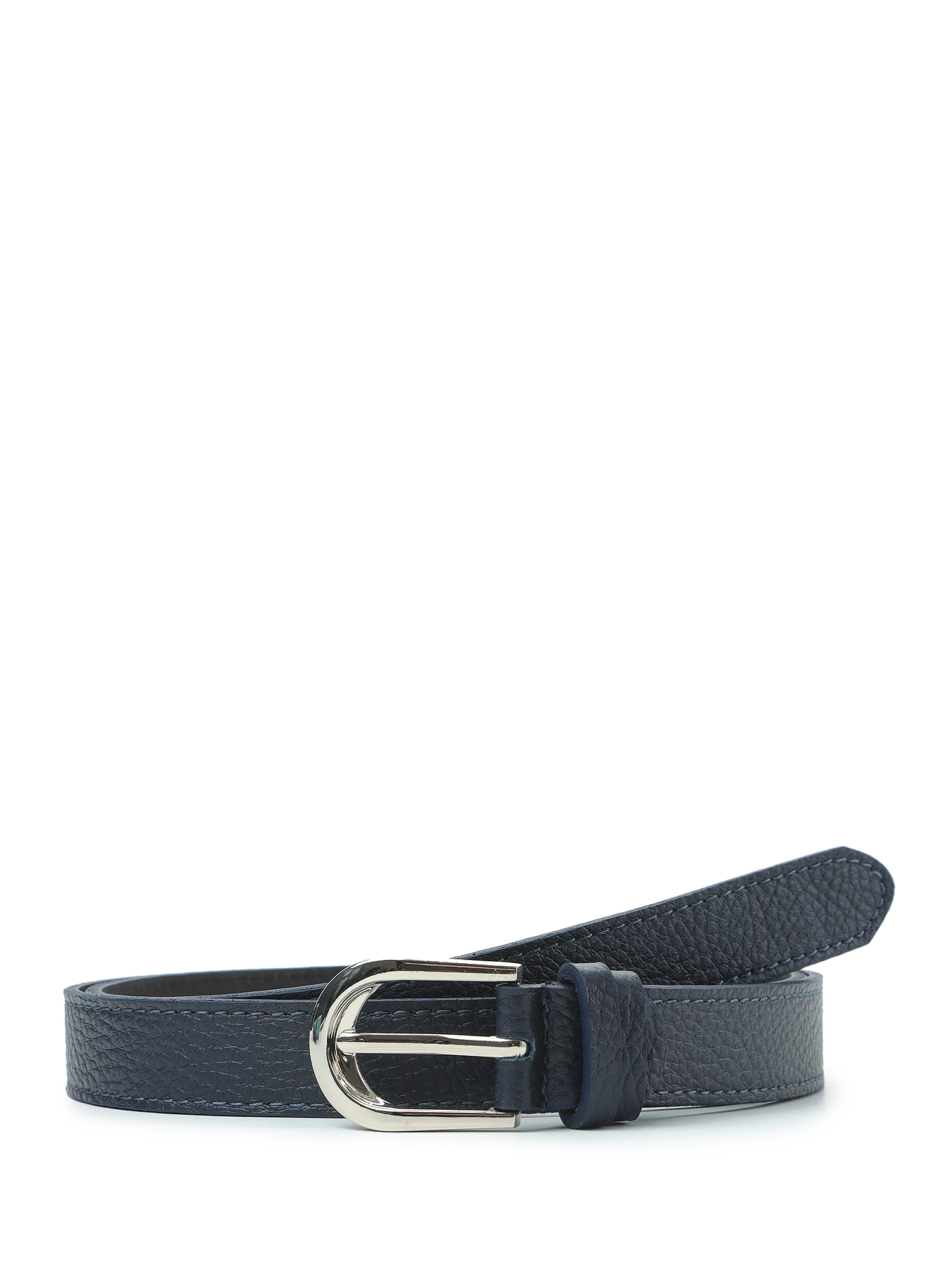 Классический женский ремень итальянского бренда FABRETTI темно-синего цвета, выполнен из натуральной кожи с крупнозернистой фактурой. Тыльная сторона - из кожи с гладкой фактурой.