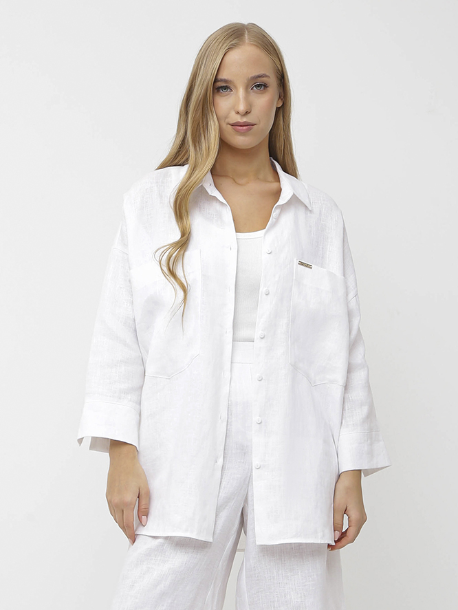 Рубашка женская свободной посадки итальянского бренда FABRETTI выполнена из 100% высококачественного льна, который отличается мягкостью, воздухопроницаемостью и приятен к телу. Классический воротник, рукава три четверти и застежка на пуговицах дополняют элегантный дизайн. На лицевой стороне рубашки расположены два кармана. Модель имеет прямой силуэт, не сковывает движений и прекрасно подходит как для повседневной носки, так и для создания более нарядного образа. Ткань приятная к телу, не вызывает раздражения и аллергических реакций.