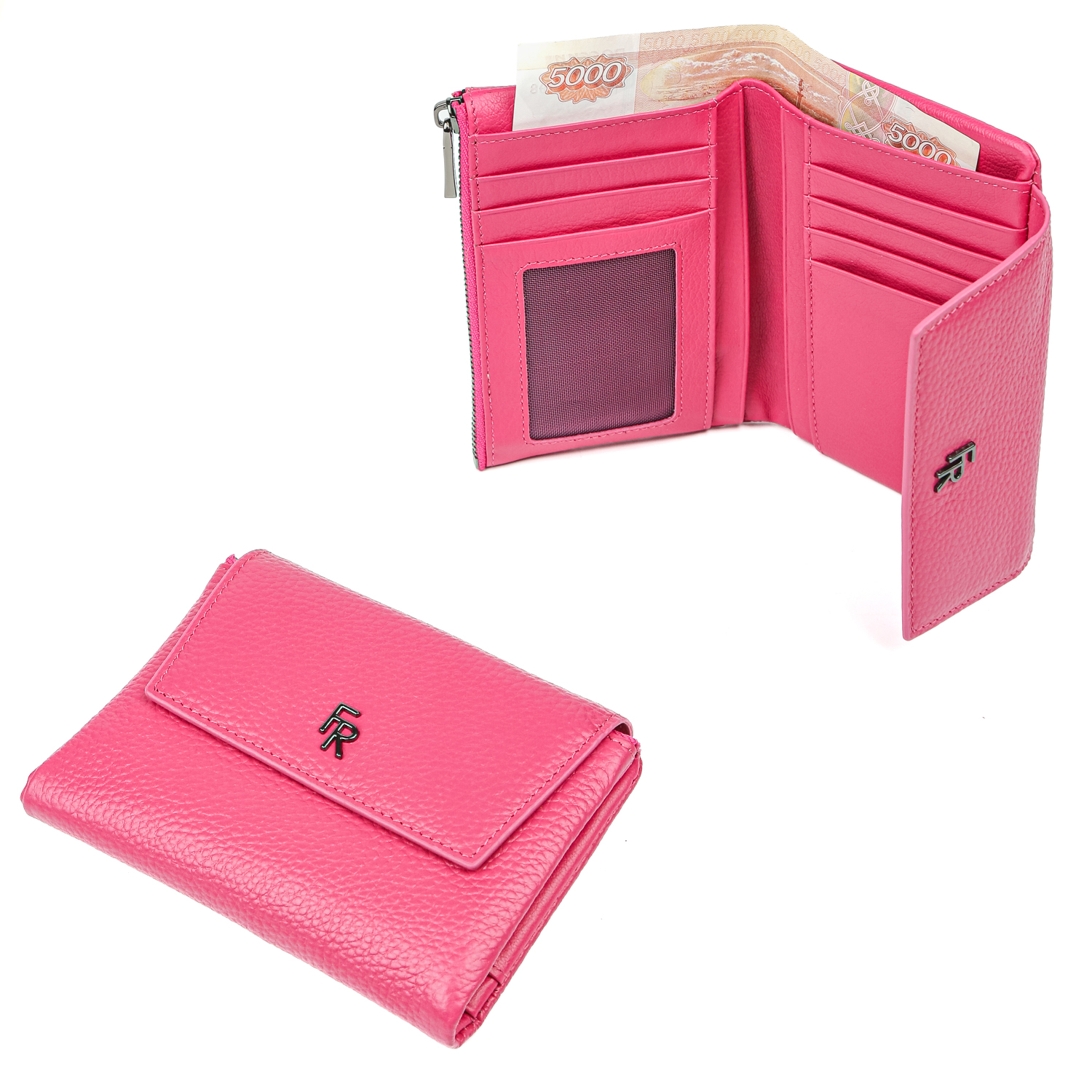 Женский складной кошелек FABRETTI в насыщенном оттенке фуксии выполнен из натуральной зернистой кожи. Аксессуар закрывается клапаном с потайными магнитными кнопками. Внутри 1 отделение для купюр, 1 боковой карман на молнии, 11 слотов для дисконтных и банковских карт, один из которых - с прозрачной вставкой. Отделение для монет расположено на тыльной стороне аксессуара и закрывается на молнию. Цвет фурнитуры - черненый никель.