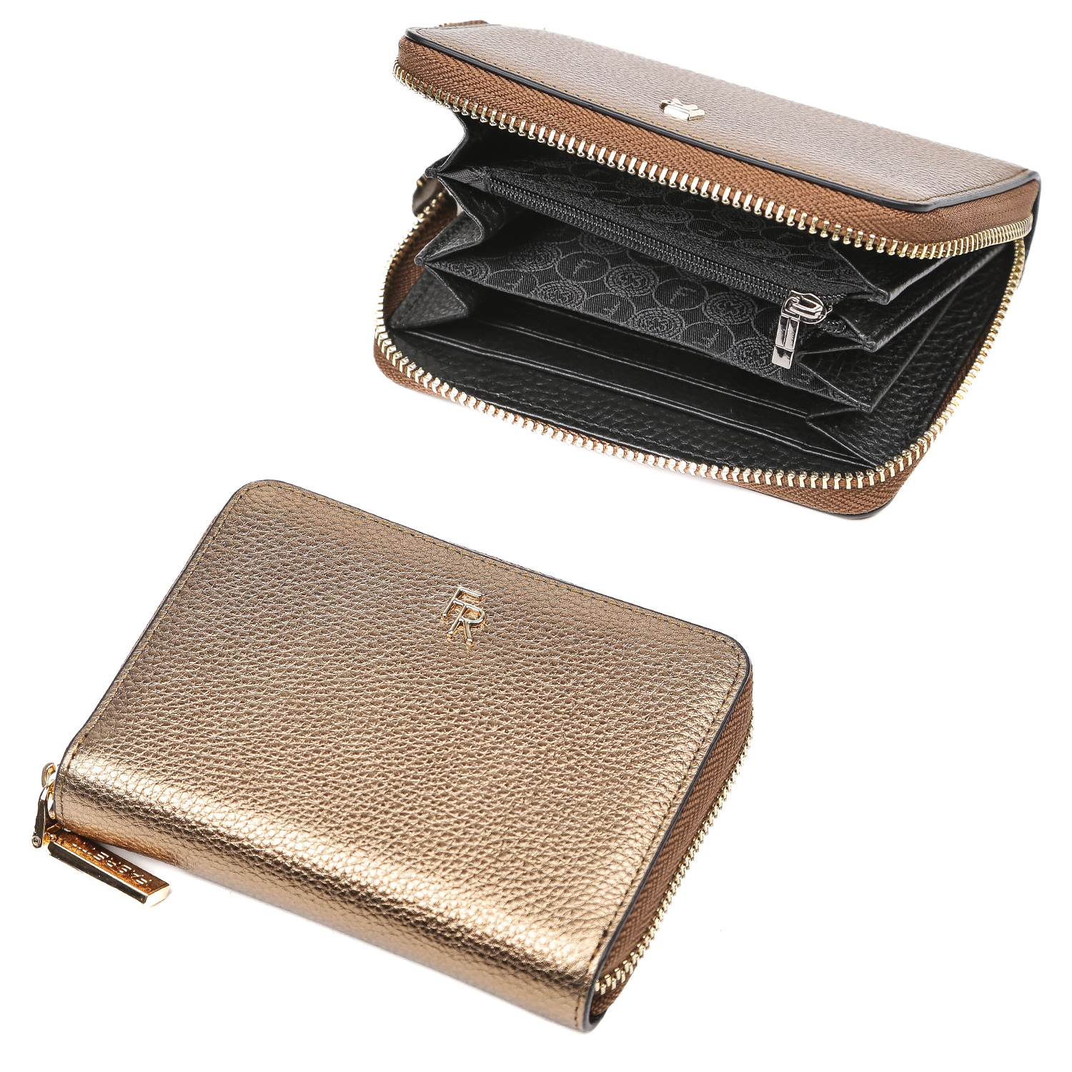 Женский кошелек FABRETTI в оттенке темное золото выполнен из натуральной металлизированной кожи. Внутренняя часть - из натуральной зернистой кожи в черном цвете.