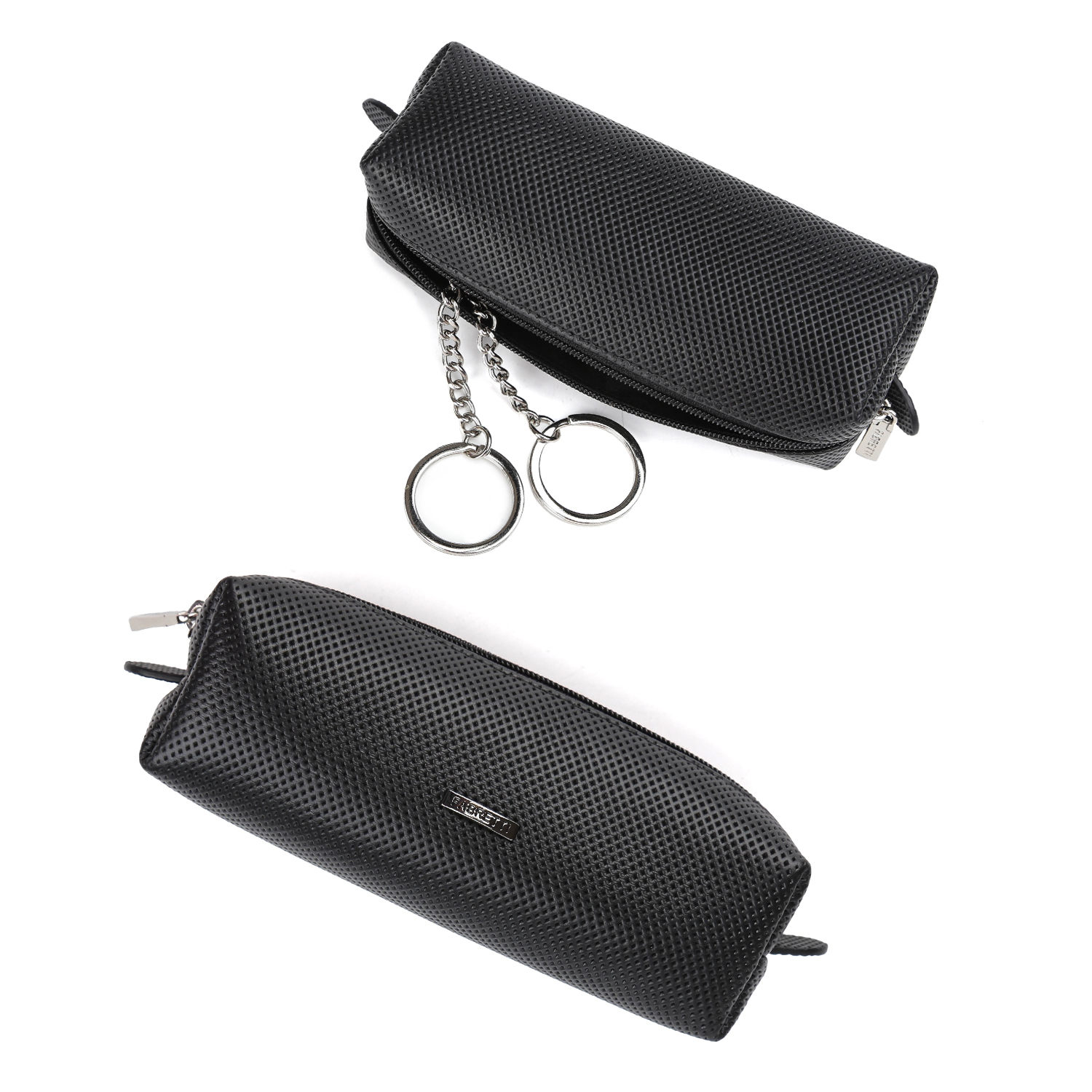 Внутри одно отделение с подкладкой, дополненное металлическим держателем для ключей на цепочке. Застегивается на молнию. На внешней стороне небольшой металлический логотип.