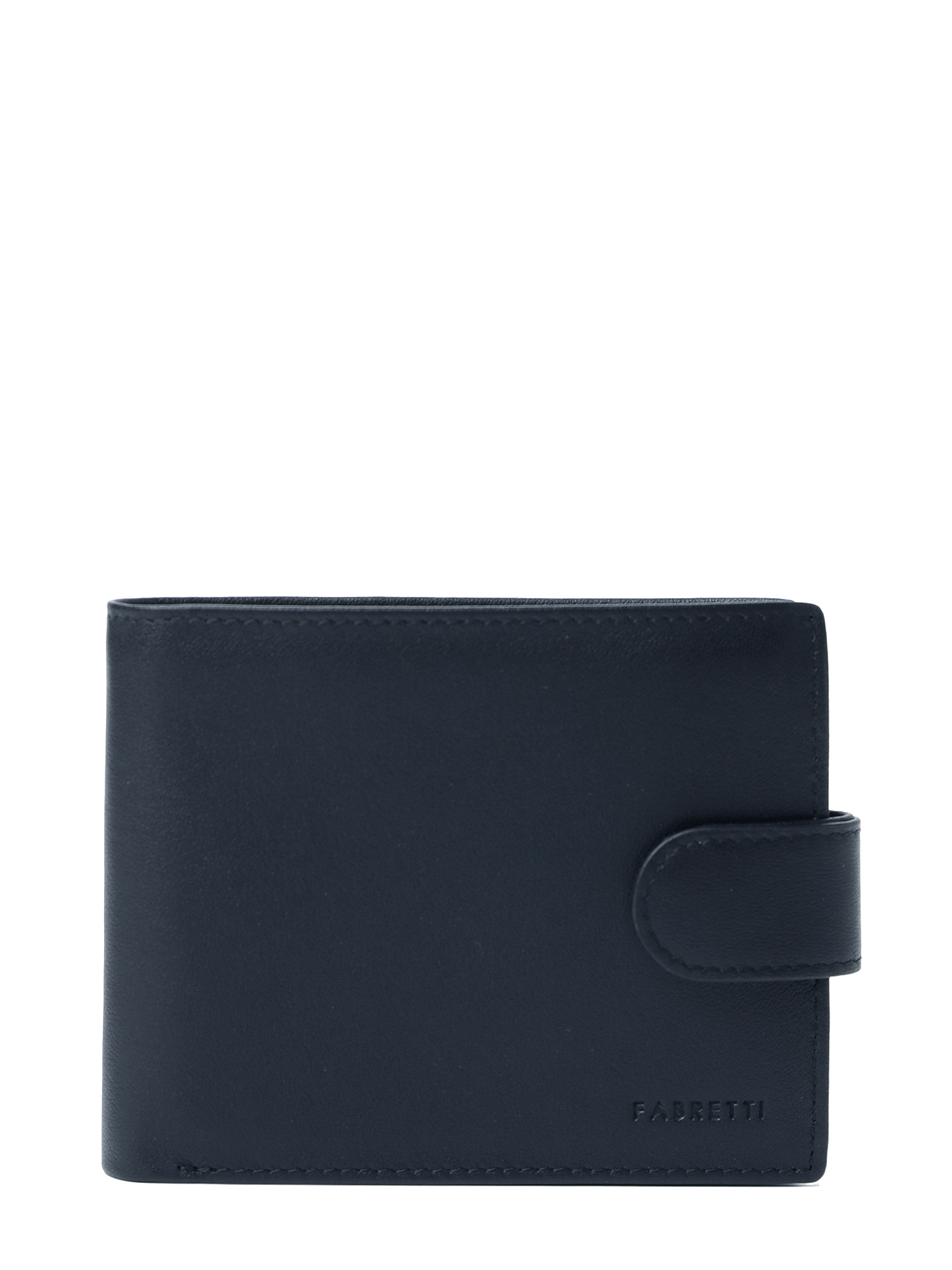 Складной мужской кошелек итальянского бренда FABRETTI выполнен из натуральной гладкой кожи в синем оттенке.