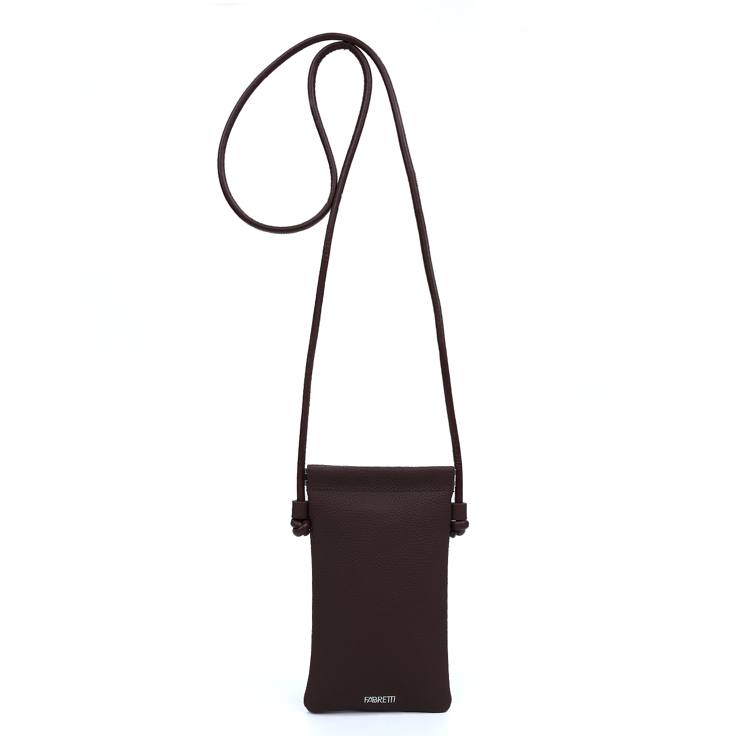 Необычная вертикальная женская сумка для телефона через плечо итальянского бренда FABRETTI выполнена из мягкой натуральной кожи коричневого цвета с крупнозернистой фактурой. Основное отделение закрывается на гибкий замок-рамку.