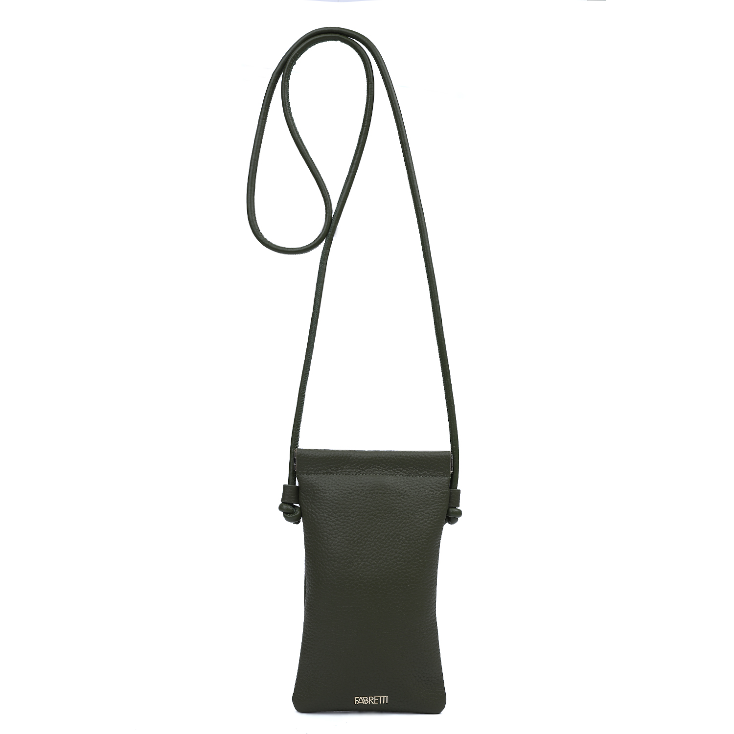 Необычная вертикальная женская сумка для телефона через плечо итальянского бренда FABRETTI выполнена из мягкой натуральной кожи темно-зеленого оттенка с крупнозернистой фактурой. Основное отделение закрывается на гибкий замок-рамку.