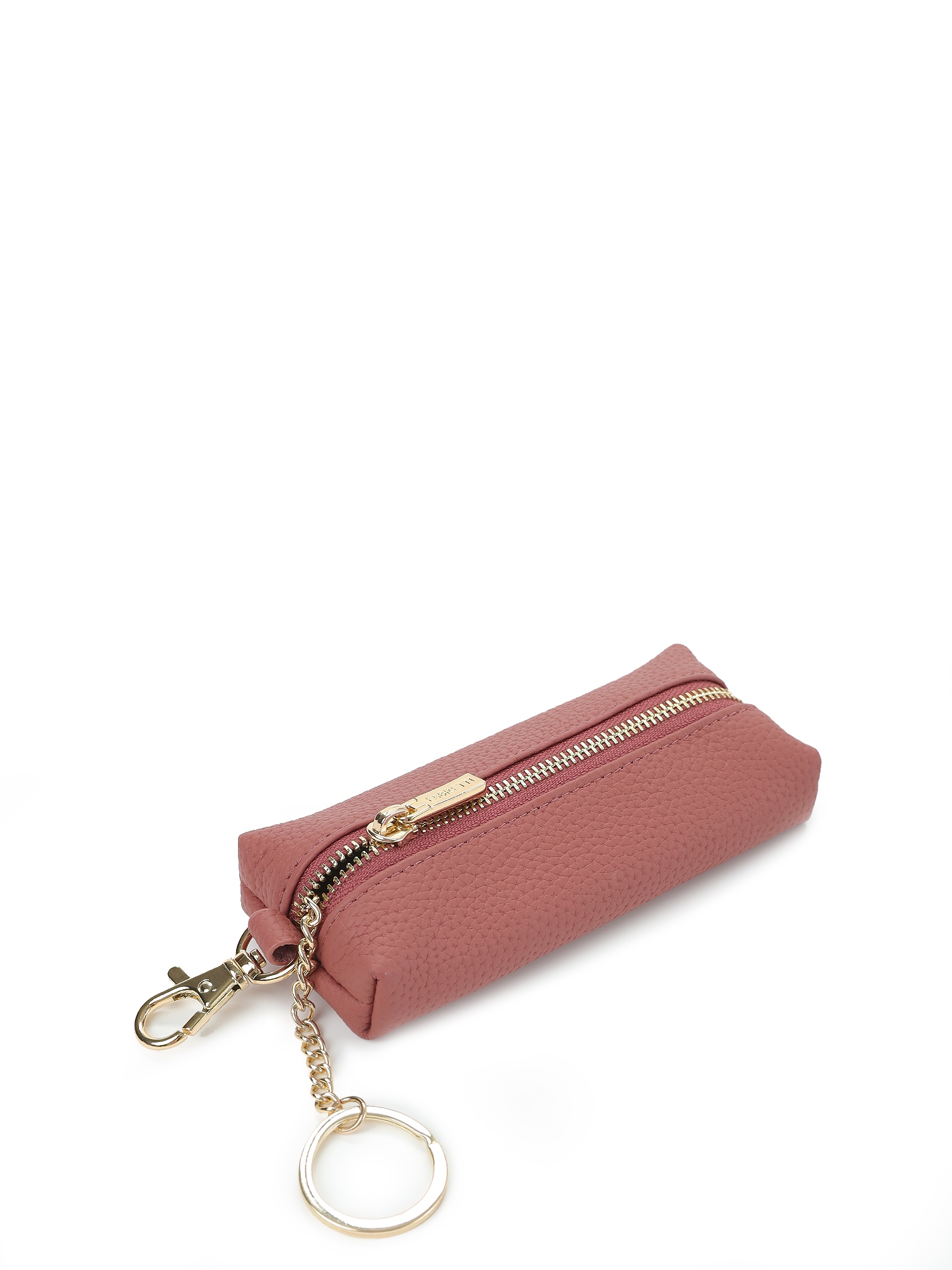 Внутри одно отделение для ключей и удобный металлический держатель на цепочке. На внешней стороне предусмотрен карабин. Аксессуар закрывается на металлическую молнию. Цвет фурнитуры – золото.