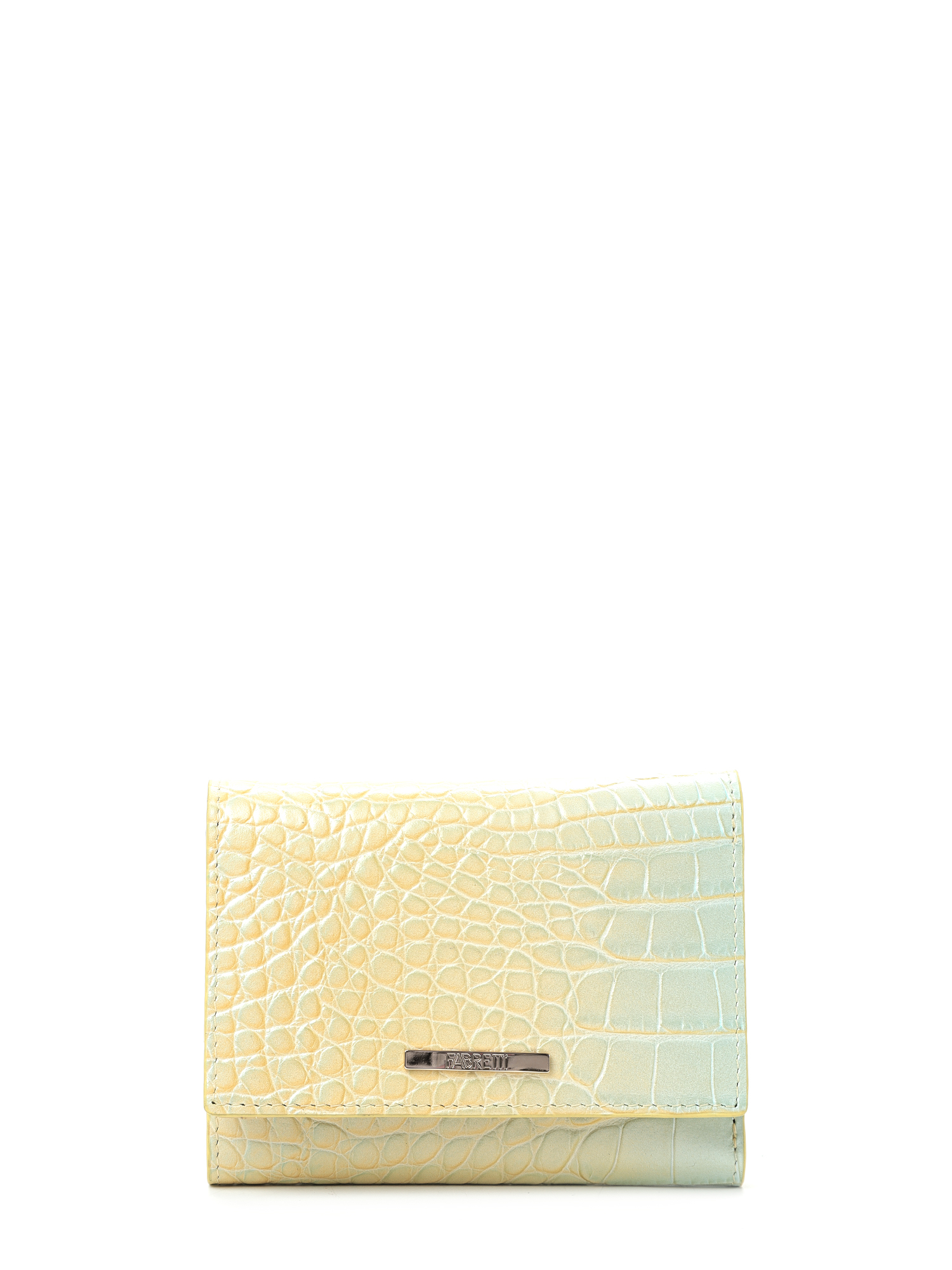 Женский складной кошелек итальянского бренда FABRETTI выполнен из натуральной кожи светло-желтого цвета «акация». Внешняя сторона украшена оригинальным тиснением под шкуру рептилии и дополнена желто-голубым градиентом, внутренняя часть из гладкой однотонной кожи. Аксессуар закрывается клапаном с кнопкой.