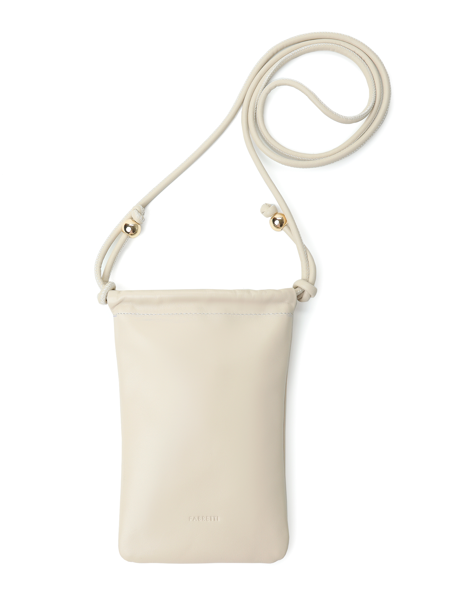 Лаконичная вертикальная женская сумка для телефона итальянского бренда FABRETTI выполнена из мягкой натуральной кожи наппа в нежном молочном оттенке с гладкой фактурой. Основное отделение закрывается на кулиску.