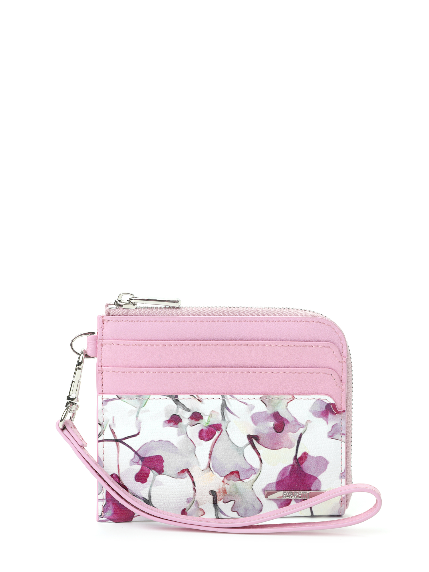 Милая женская визитница итальянского бренда FABRETTI из натуральной кожи с цифровой печатью. Дизайн модели сочетает узор из лилово-розовых акварельных цветов на белом фоне и вставки нежного розового цвета.