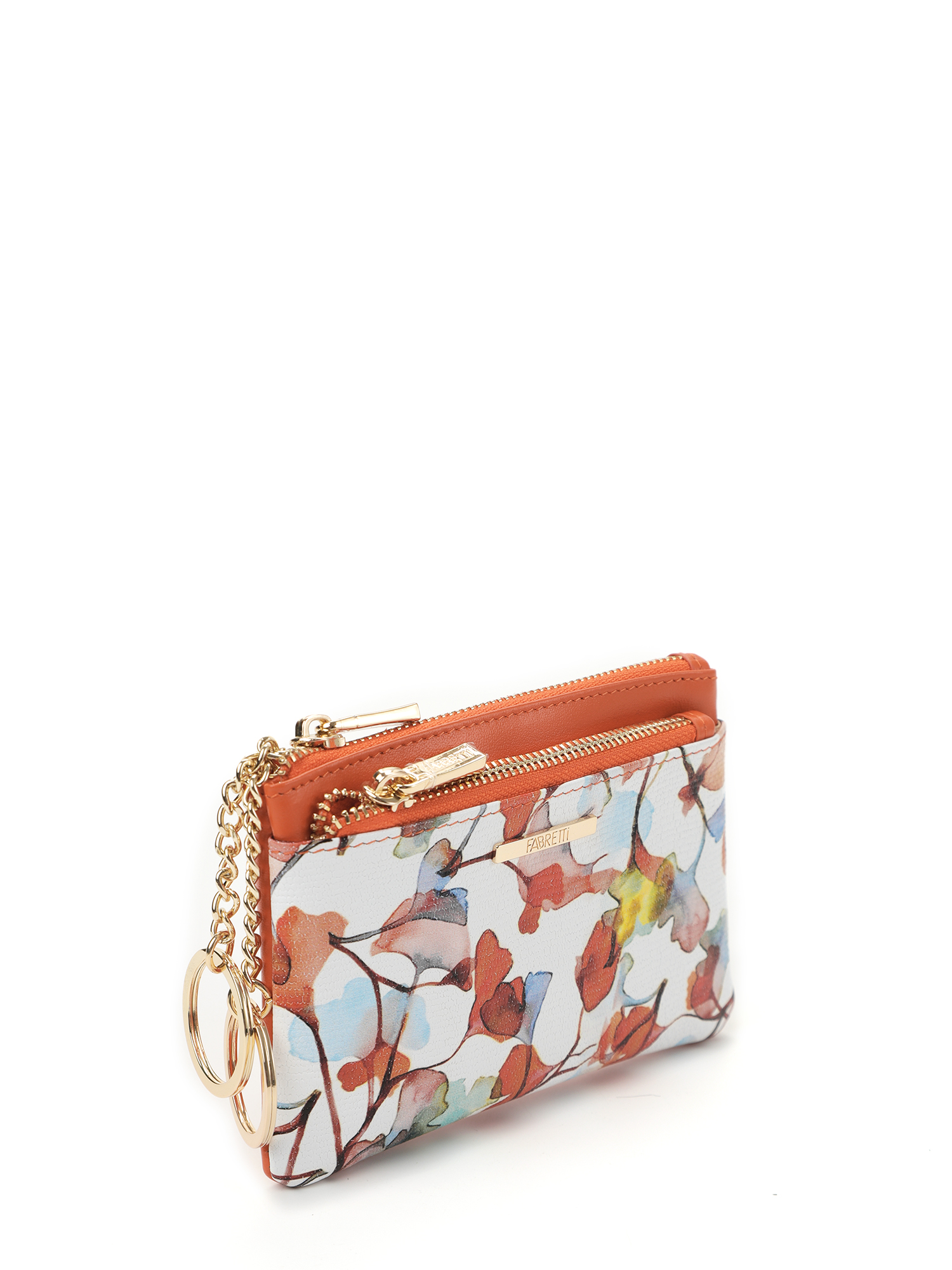 Женская ключница итальянского бренда FABRETTI из натуральной кожи в оригинальном дизайне. Лицевая сторона украшена узором из оранжевых акварельных цветов на белом фоне, тыльная сторона яркого оранжевого цвета. Завершает декор небольшой металлический шильд с логотипом.