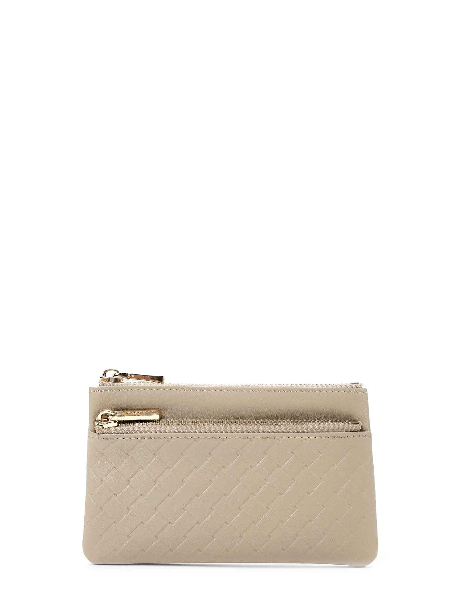 Основное отделение застегивается на молнию, внутри оно дополнено металлическим кольцом для ключей на цепочке и тремя слотами для карт. Второе отделение на лицевой стороне застегивается на молнию. Цвет фурнитуры – золото.
