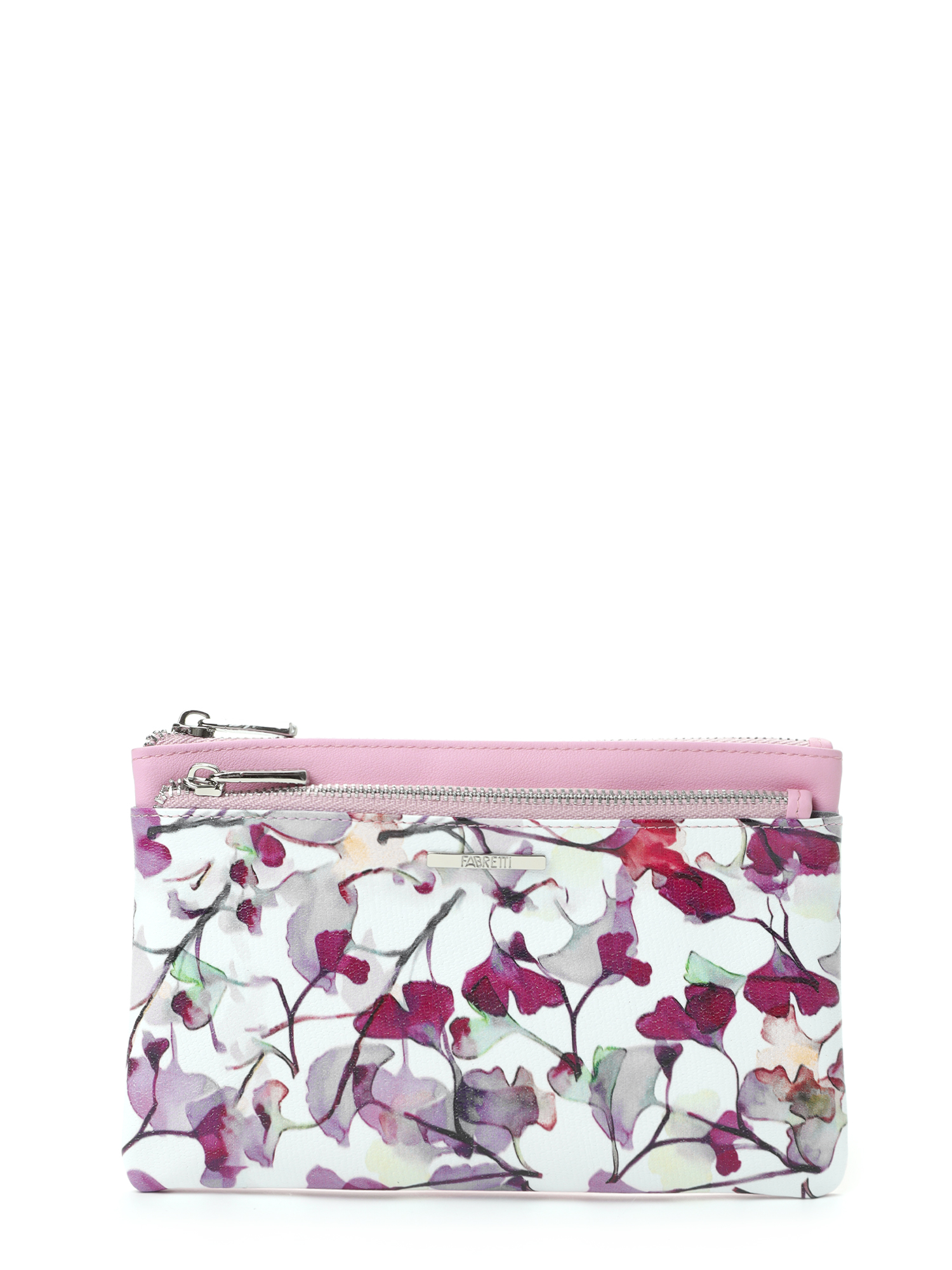 Вместительный кошелек-ключница итальянского бренда FABRETTI выполнен из натуральной мелкозернистой кожи и может выполнять функции косметички. Лицевая сторона украшена узором из лилово-розовых акварельных цветов на белом фоне, тыльная сторона нежного розового цвета.