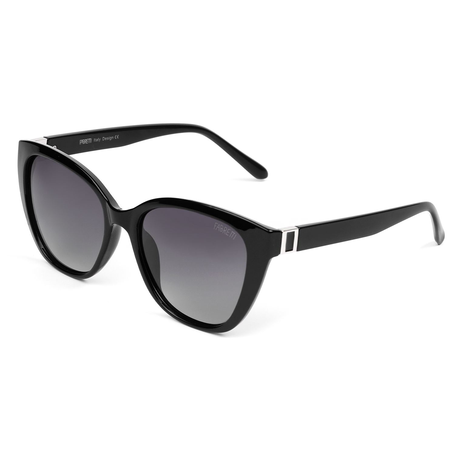 Поляризационные женские солнцезащитные очки итальянского бренда FABRETTI в глянцевой оправе "кошачий глаз" черного цвета. Градиентные темно-серые линзы позволяют видеть одинаково хорошо как в помещении, так и на солнечной улице.