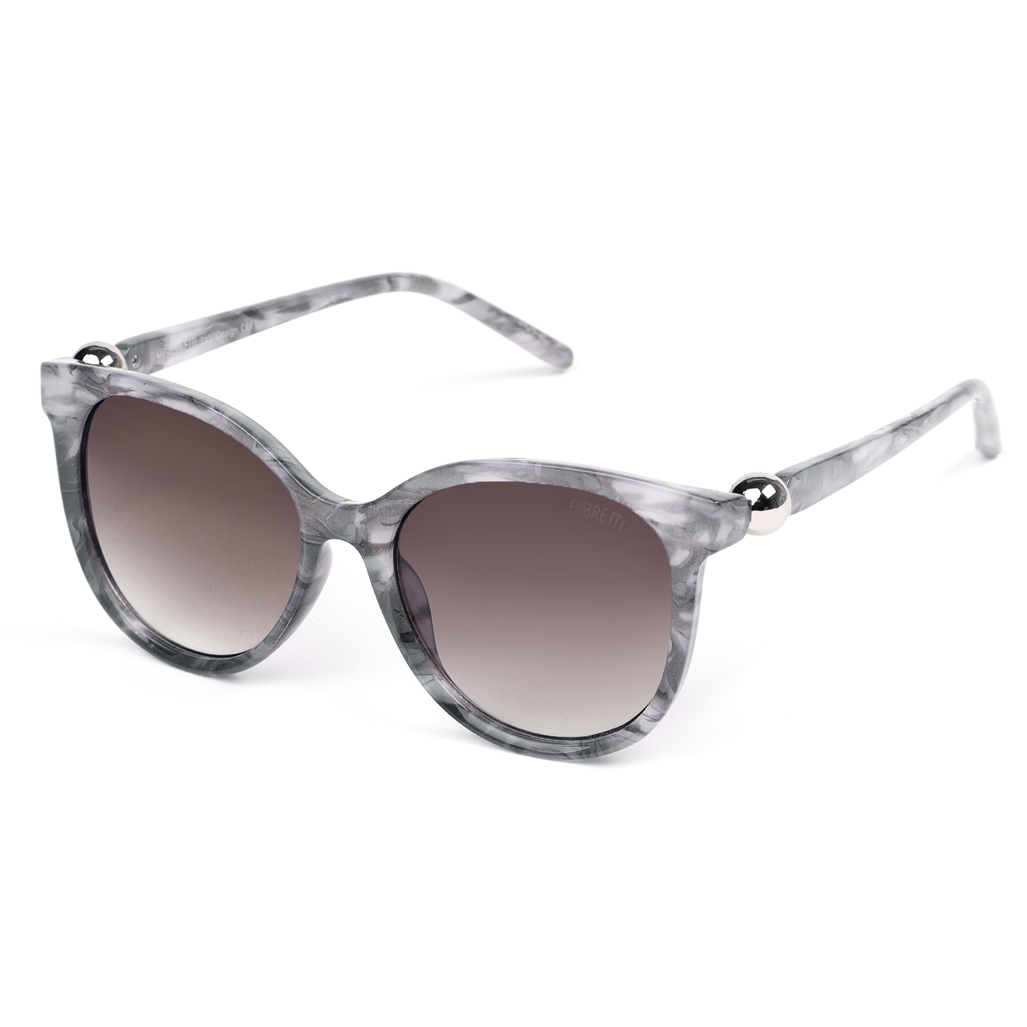 Женские солнцезащитные очки итальянского бренда FABRETTI в округлой полупрозрачной оправе "кошачий глаз" серого цвета с разводами. Градиентные серые линзы позволяют видеть одинаково хорошо как в помещении, так и на солнечной улице.
