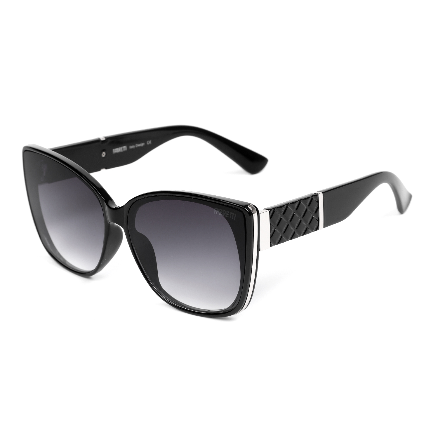 Стильные женские солнцезащитные очки итальянского бренда FABRETTI в увеличенной оправе "кошачий глаз" черного цвета. Градиентные серые линзы позволяют видеть одинаково хорошо как в помещении, так и на солнечной улице.