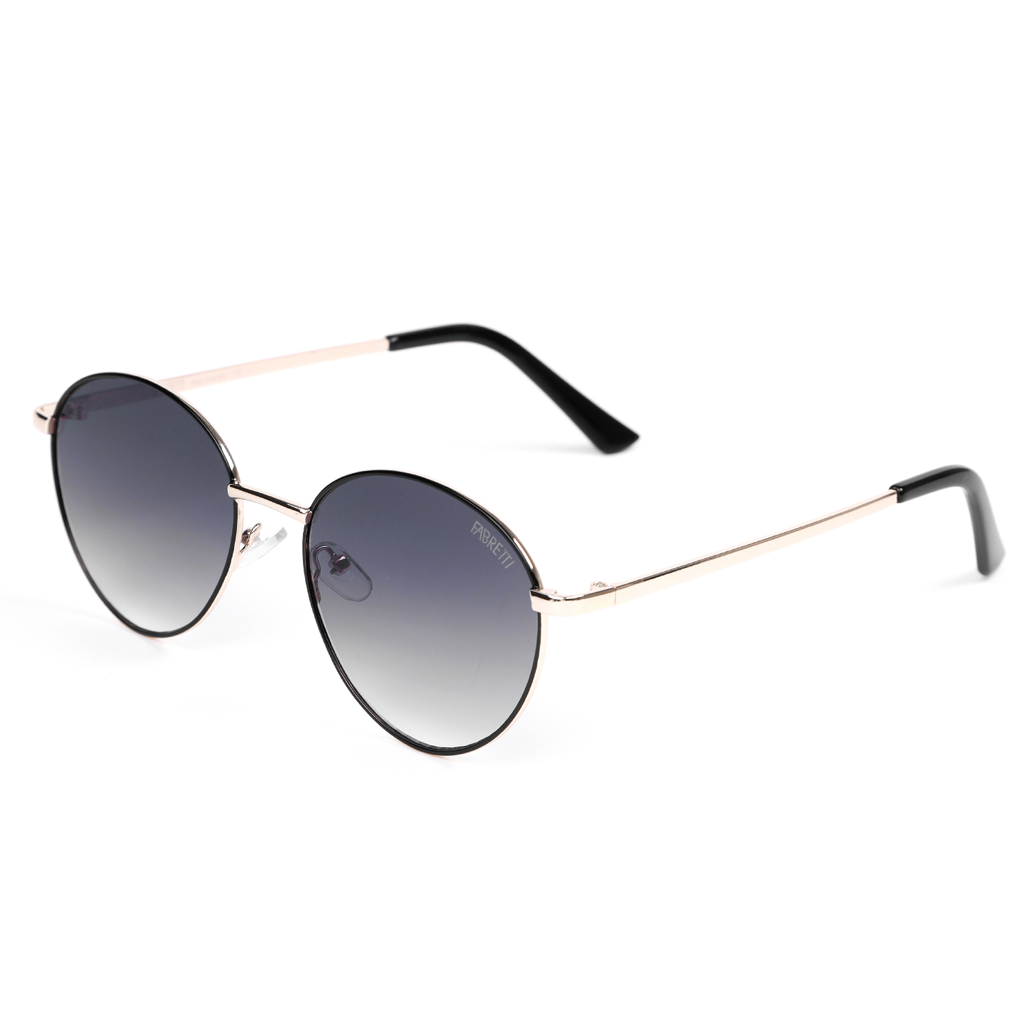 Необычные солнцезащитные очки итальянского бренда FABRETTI в округлой металлической оправе черного цвета с золотистым мостом и дужками. Градиентные темно-серые линзы позволяют видеть одинаково хорошо как в помещении, так и на солнечной улице.