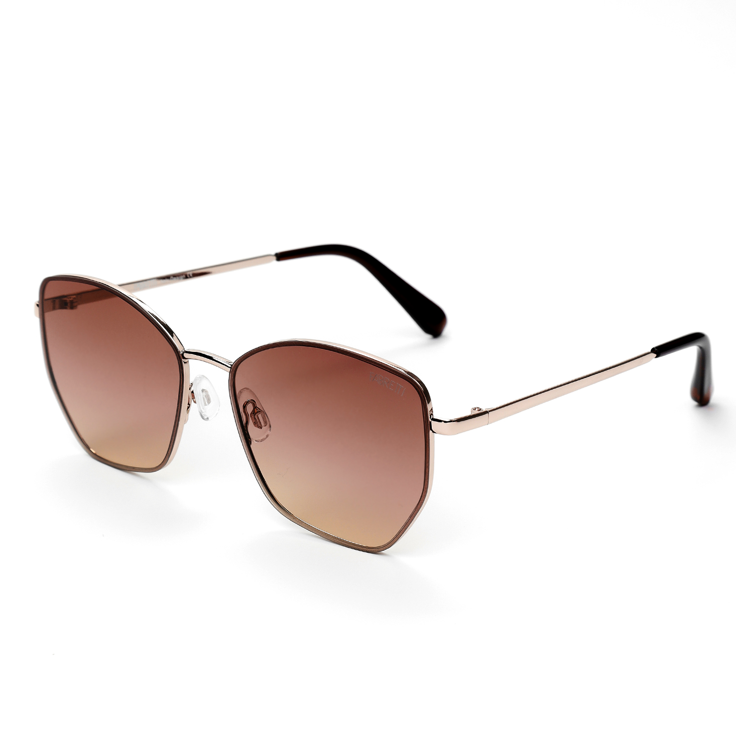 Женские солнцезащитные очки итальянского бренда FABRETTI необычной геометрической формы в тонкой металлической оправе золотистого оттенка. Градиентные бежево-розовые линзы позволяют видеть одинаково хорошо как в помещении, так и на солнечной улице.