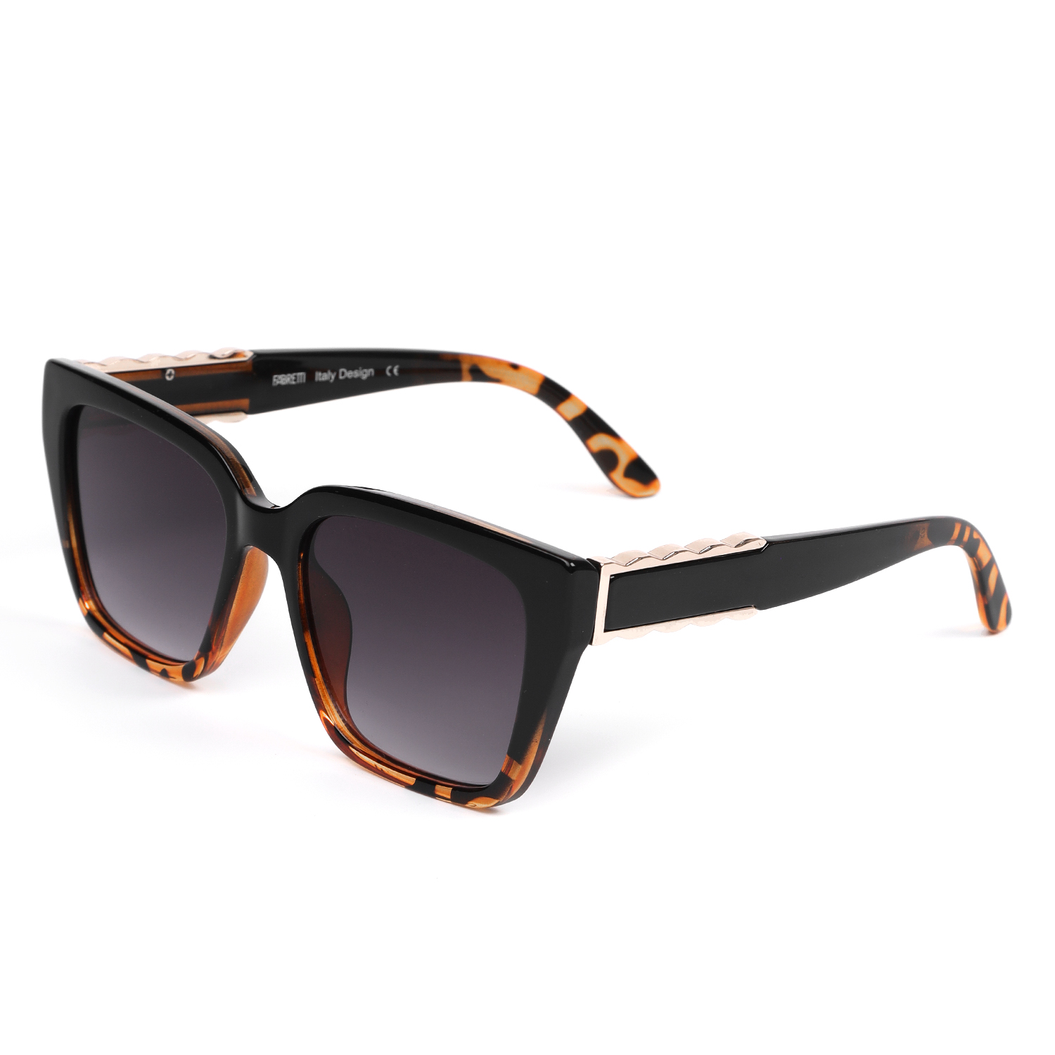 Оригинальные солнцезащитные очки итальянского бренда FABRETTI в градиентной оправе формы "кошачий глаз". Верх оправы однотонно-черный верх оправы плавно переходит в полупрозрачный коричневый цвет с анималистичным узором. Градиентные серые линзы позволяют видеть одинаково хорошо как в помещении, так и на солнечной улице.