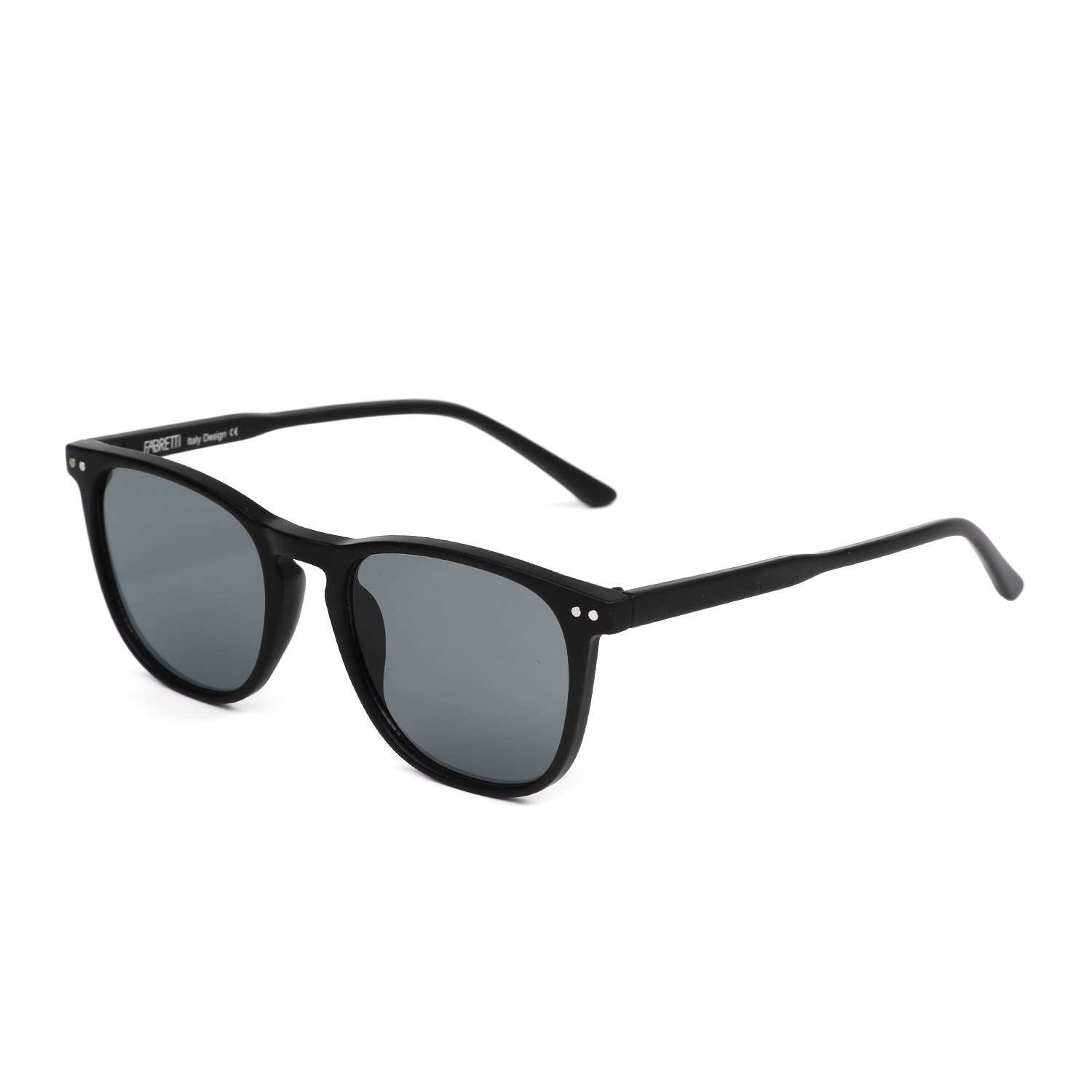 Современные солнцезащитные очки итальянского бренда FABRETTI в узкой черной оправе трапециевидной формы с матовым покрытием. Однотонные серо-голубые линзы позволяют видеть одинаково хорошо как в помещении, так и на солнечной улице.