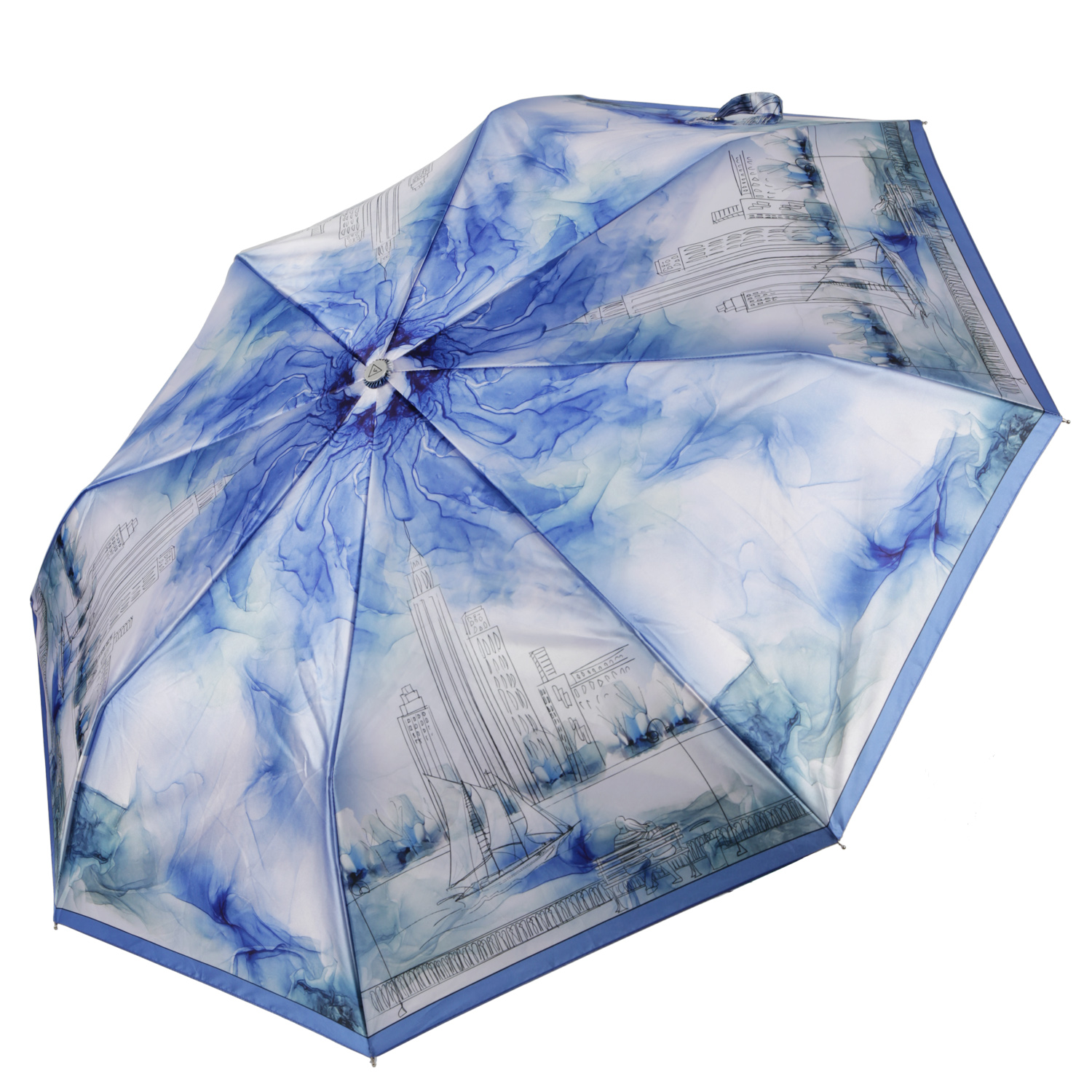 Купол зонта-автомата FABRETTI выполнен из полиэстера с приятной гладкой фактурой и сатиновым блеском. Вода, попадая на такой купол, превращается в капли и легко скатываться вниз. Зонт украшен авторским принтом с городскими мотивами, которые расположены клиньями и чередуются со вставками с абстрактным изображением. Четкий рисунок и тонкую цветопередачу удалось получить с помощью техники цифровой печати, которая обеспечивает долговечность изображению.