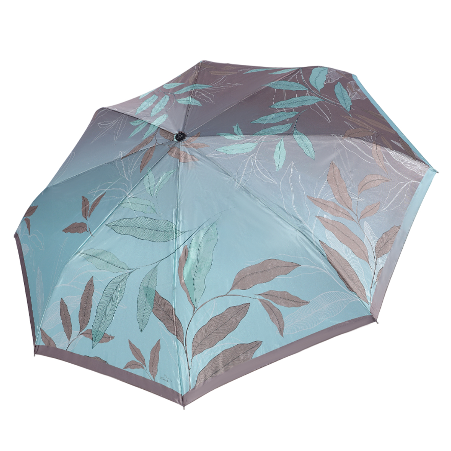 Купол зонта-автомата FABRETTI в градиентном оттенке от голубого до розового и украшен принтом с крупными листьями, выполнен из полиэстера с приятной гладкой фактурой и сатиновым блеском. Рисунок нанесен с помощью техники цифровой печати, которая обеспечивает долговечность изображению и точность цветопередачи.
