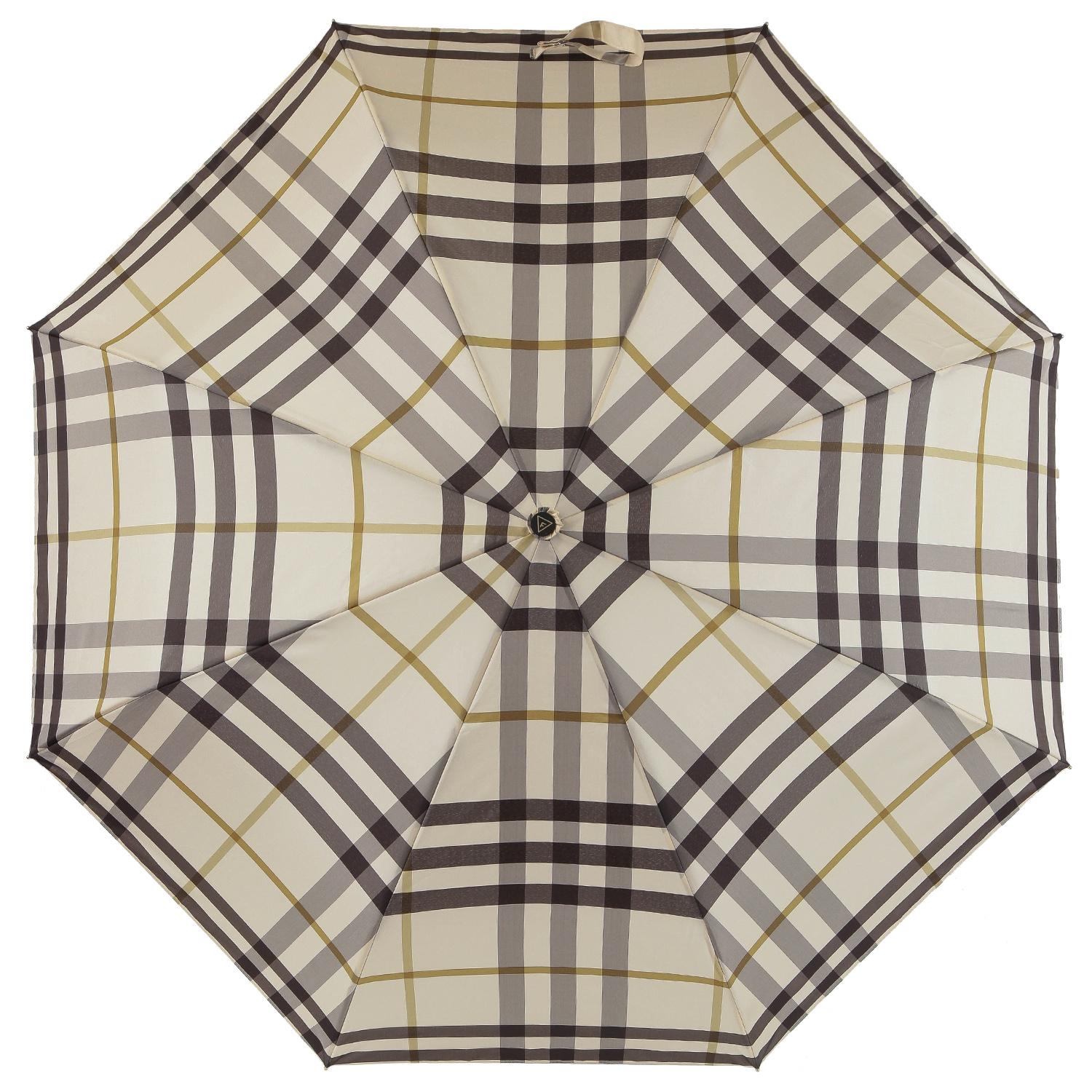 Купол зонта-автомата FABRETTI в бежевой гамме выполнен из полиэстера с плетением нити – эпонж. Такое плетение помимо матовой фактуры придает ткани высокую прочность и устойчивость к выцветанию. В качестве декора выбран принт в виде клетки.