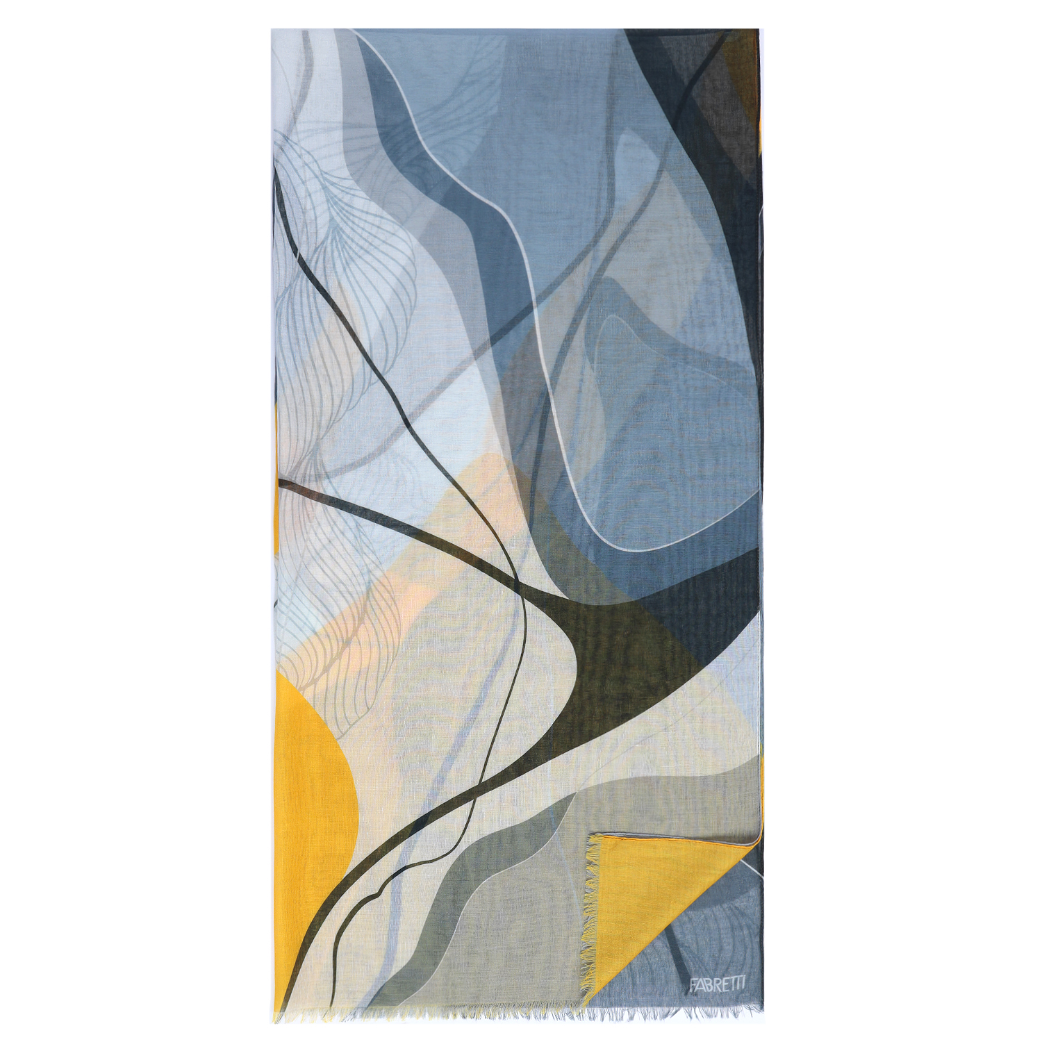 Легкий женский шарф итальянского бренда FABRETTI со сложным абстрактным узором, разводами, линиями и полосками в оттенках серо-голубого и желтого.