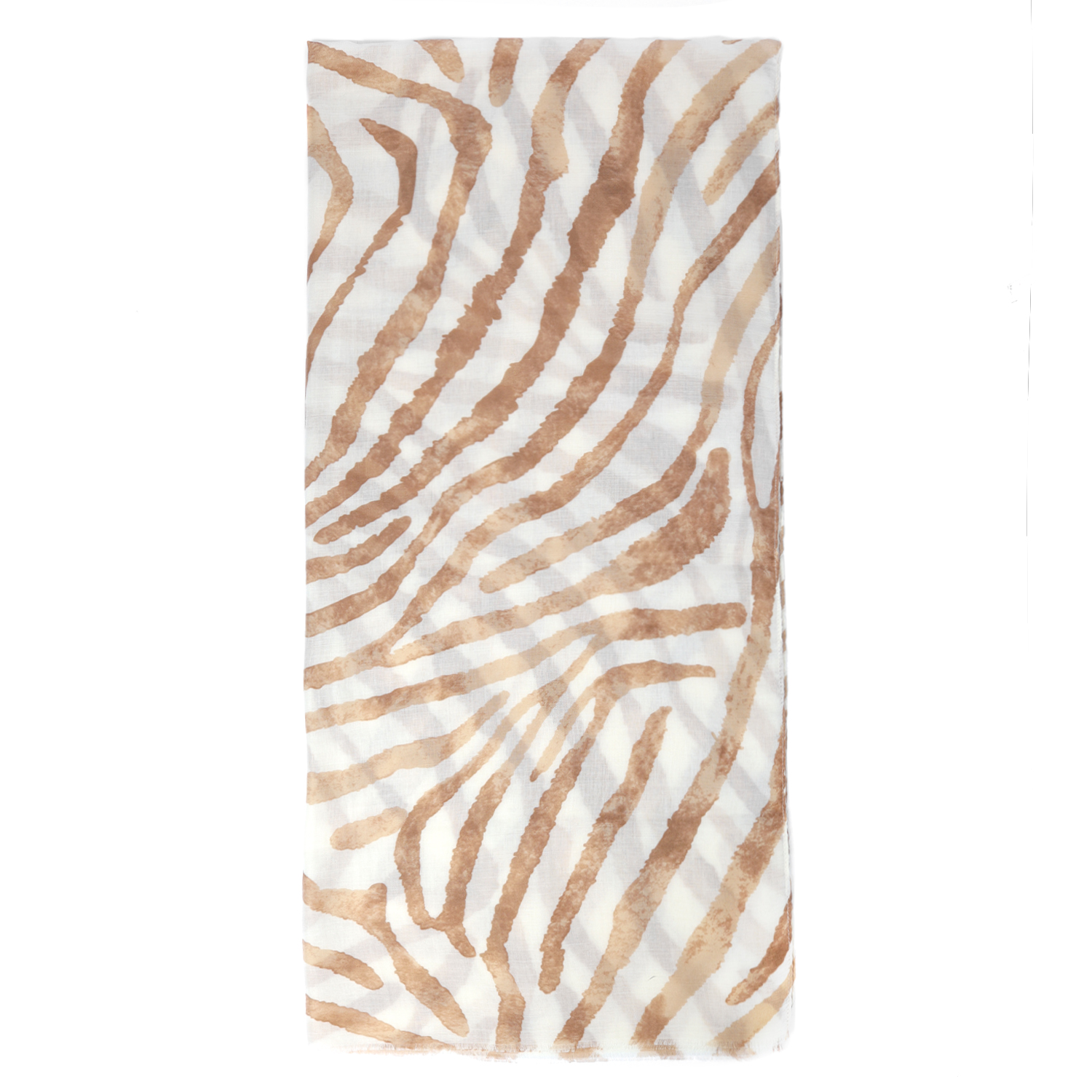 Легкий женский шарф итальянского бренда FABRETTI - прекрасный аксессуар на теплый сезон. Шарф украшен спокойным узором из светло-коричневых и бежевых полос туши на белом холсте.