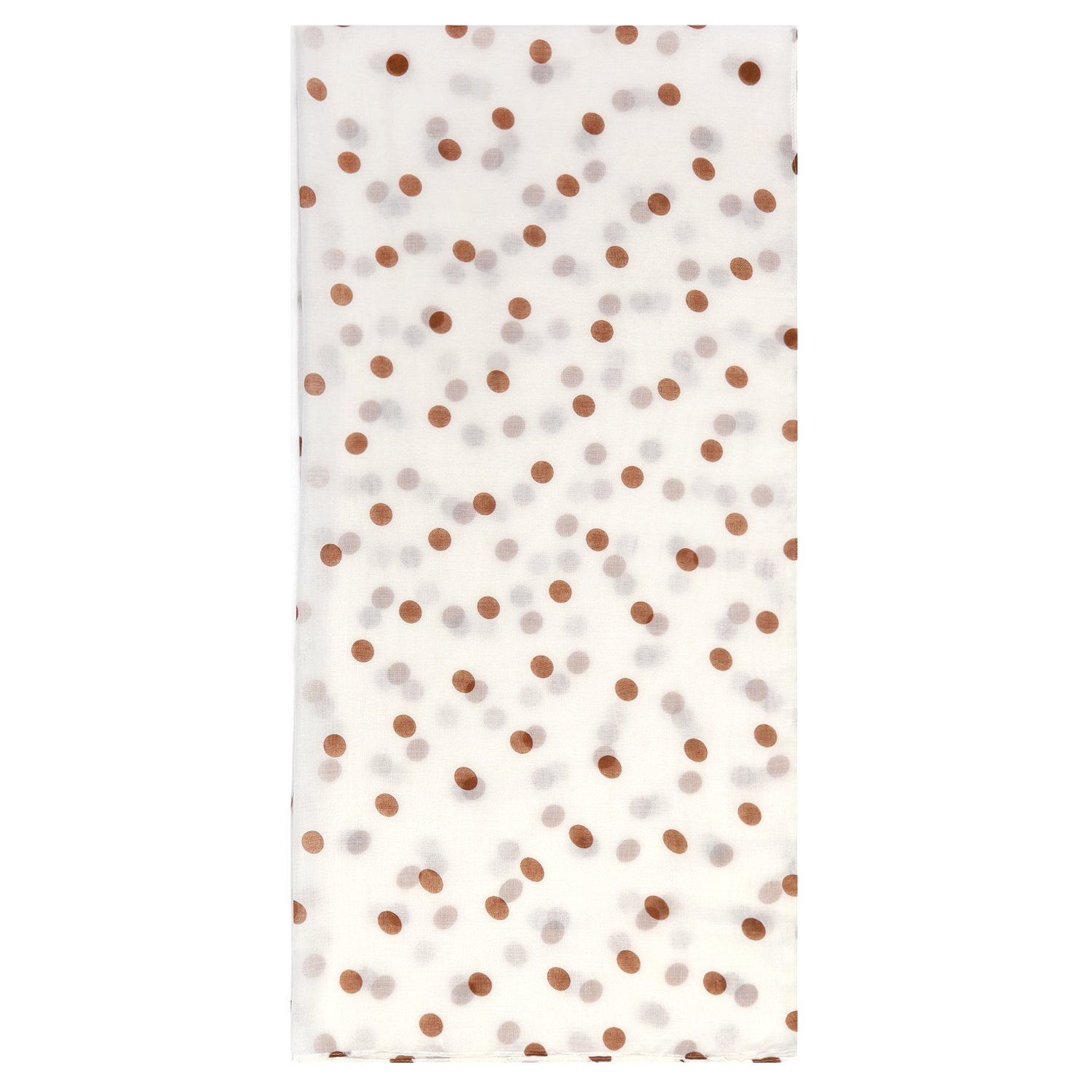 Длинный женский шарф итальянского бренда FABRETTI для теплого сезона с классическим узором в крупный коричневый горох на белом фоне.