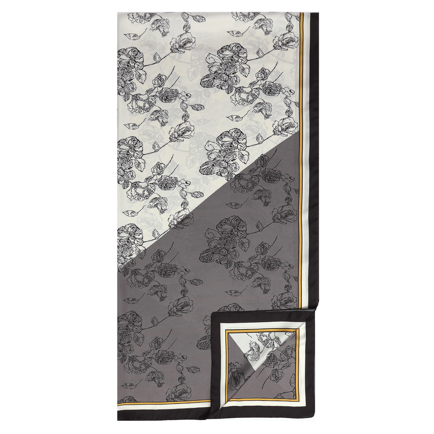 Легкий искусственный шелк, с его гладкостью и блеском, отлично сочетается с «контрастными» матовыми фактурами – хлопком, льном, замшей и натуральной кожей. Этот шарф удачно смотрится и в драпировке, образуя красивые складки с переливами на ткани, и в свободном ношении – на плечах или на шее. Дополнительным акцентом служит тонкая золотая линия по периметру шарфа.