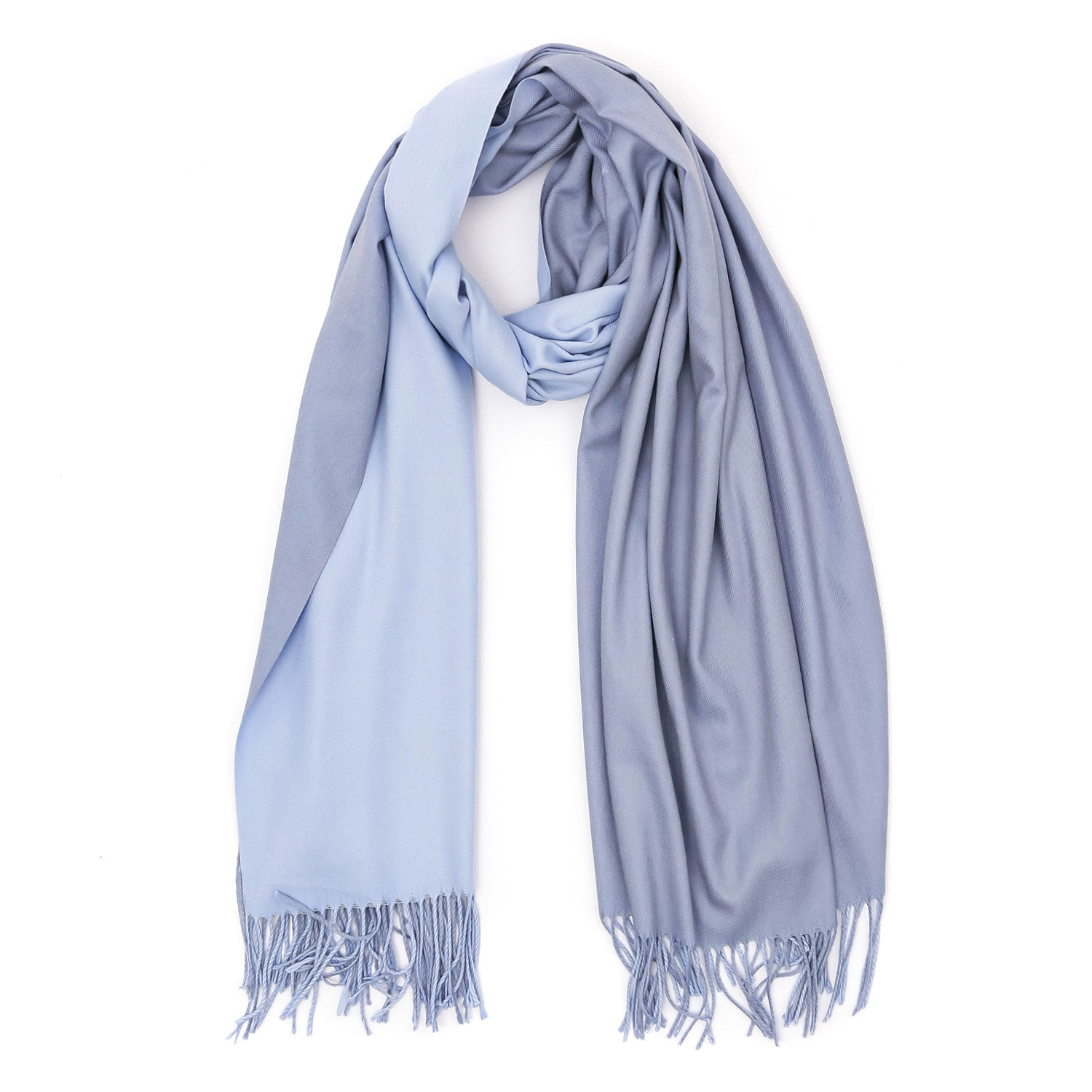 Двусторонний шарф FABRETTI прекрасно подходит на роль базового аксессуара. Одна сторона выполнена в насыщенном темно-голубом оттенке, другая – в светло-голубом. Аксессуар выполнен из вискозы с добавлением качественного полиэстера. Изделие дарит ощущение комфорта и тепла, красиво драпируется. Концы украшены бахромой. Размер 65*180 см.