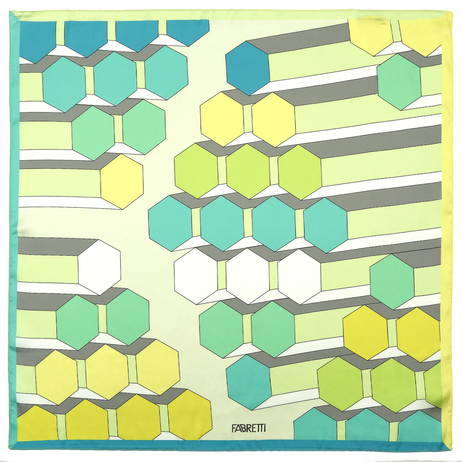 Оригинальный платок итальянского бренда FABRETTI, украшенный «объемными» геометрическими фигурами в зеленых и желтых тонах. Искусственный шелк прекрасно сочетается с тканями самых разных фактур, материал хорошо переносит чистку, не деформируется и не выцветает.