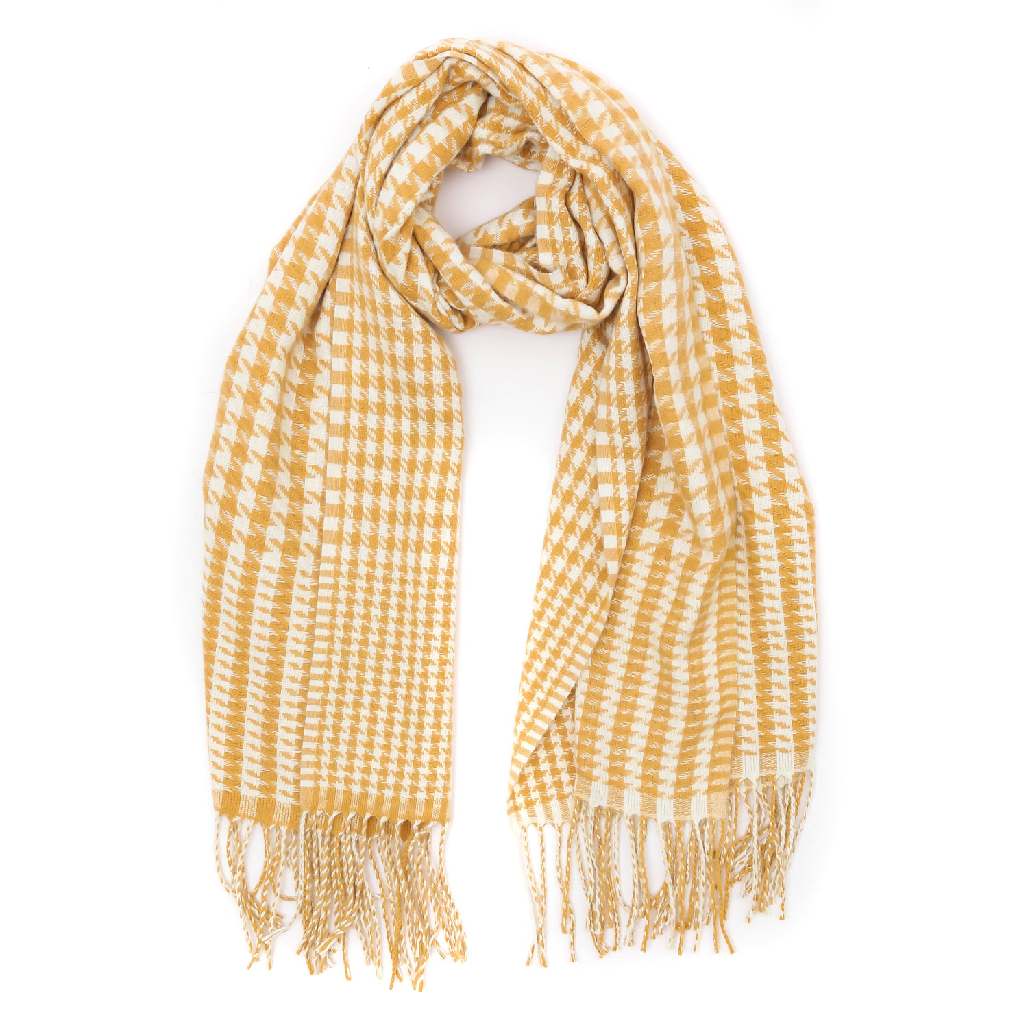 Стильный шарф FABRETTI обладает мягкой текстурой и дополнит любой образ. Изысканные оттенки бежевого в сочетании с узором «гусиная лапка» придают изделию особую выразительность. Аксессуар выполнен из качественного полиэстера приятного на ощупь. Дарит ощущение тепла и комфорта, легко драпируется, долго сохранит форму и цвет. Концы украшены бахромой. Размер 70*180 см.