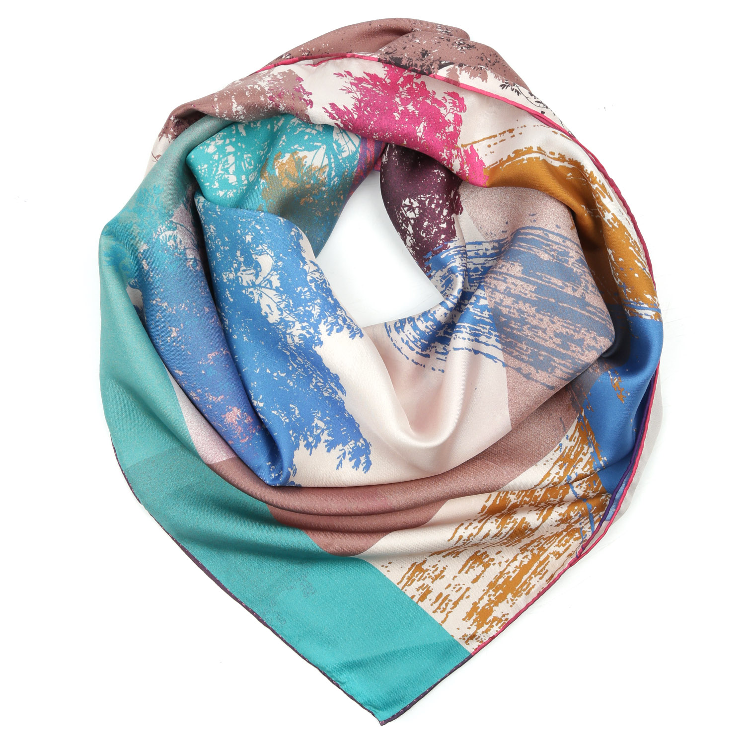 Необычный шелковый платок итальянского бренда FABRETTI, украшенный принтом с силуэтами деревьев и мазками кисти, оформленный в ярких голубых, розовых и бежевых тонах.