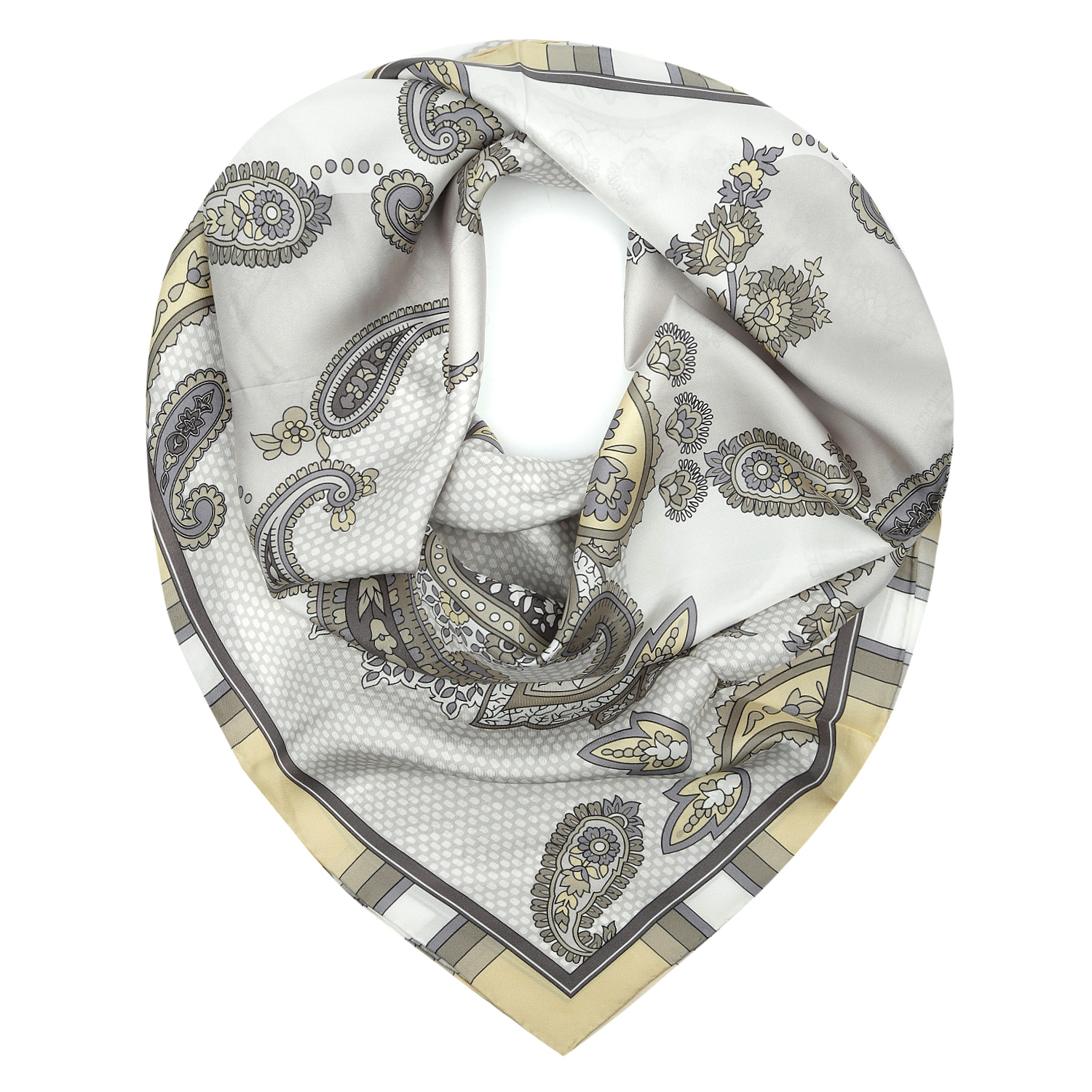 Оригинальный шелковый платок итальянского бренда FABRETTI, украшенный классическим восточным узором пейсли в серых и желтых тонах.
