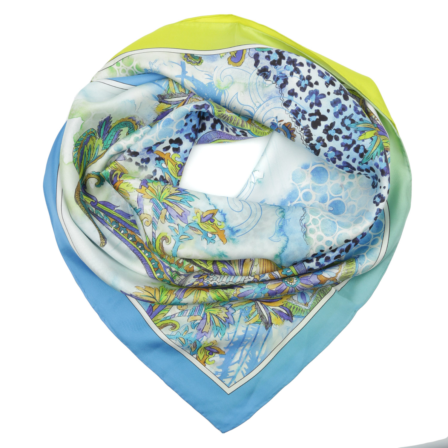 Платок украшен сложным узором, сочетающим восточные мотивы и пейсли, классический леопардовый принт, горох, акварельные разводы и другие элементы. Сложный многослойный принт соответствует актуальной моде на смелые комбинации стилей. Благодаря разнообразию элементов платок сочетается с однотонной одеждой разных цветовых гамм.