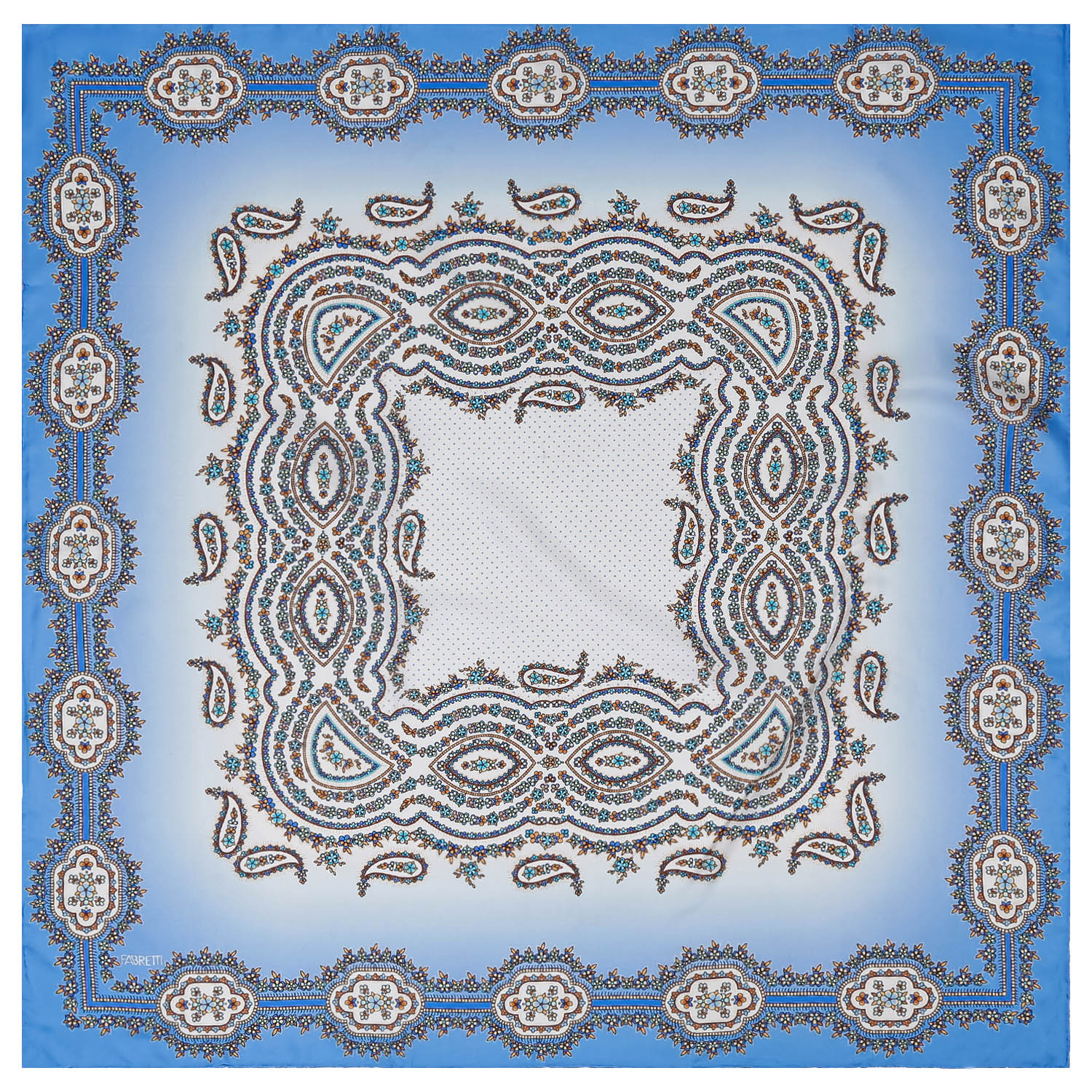 Красивый платок Fabretti украшен изысканным принтом пейсли. Тончайший шелковый материал струится и переливается на свету, а узор «огурец» выполнен с особой тщательностью. Каждая деталь платка говорит о высоком качестве и внимательности к деталям. Этот платок станет важной частью вашей коллекции аксессуаров и подчеркнет ваш превосходный вкус. Платок выполнен из 100% шелка. Размер 90*90, вес 42г. Края обработаны вручную. Плотность - 12 момми.