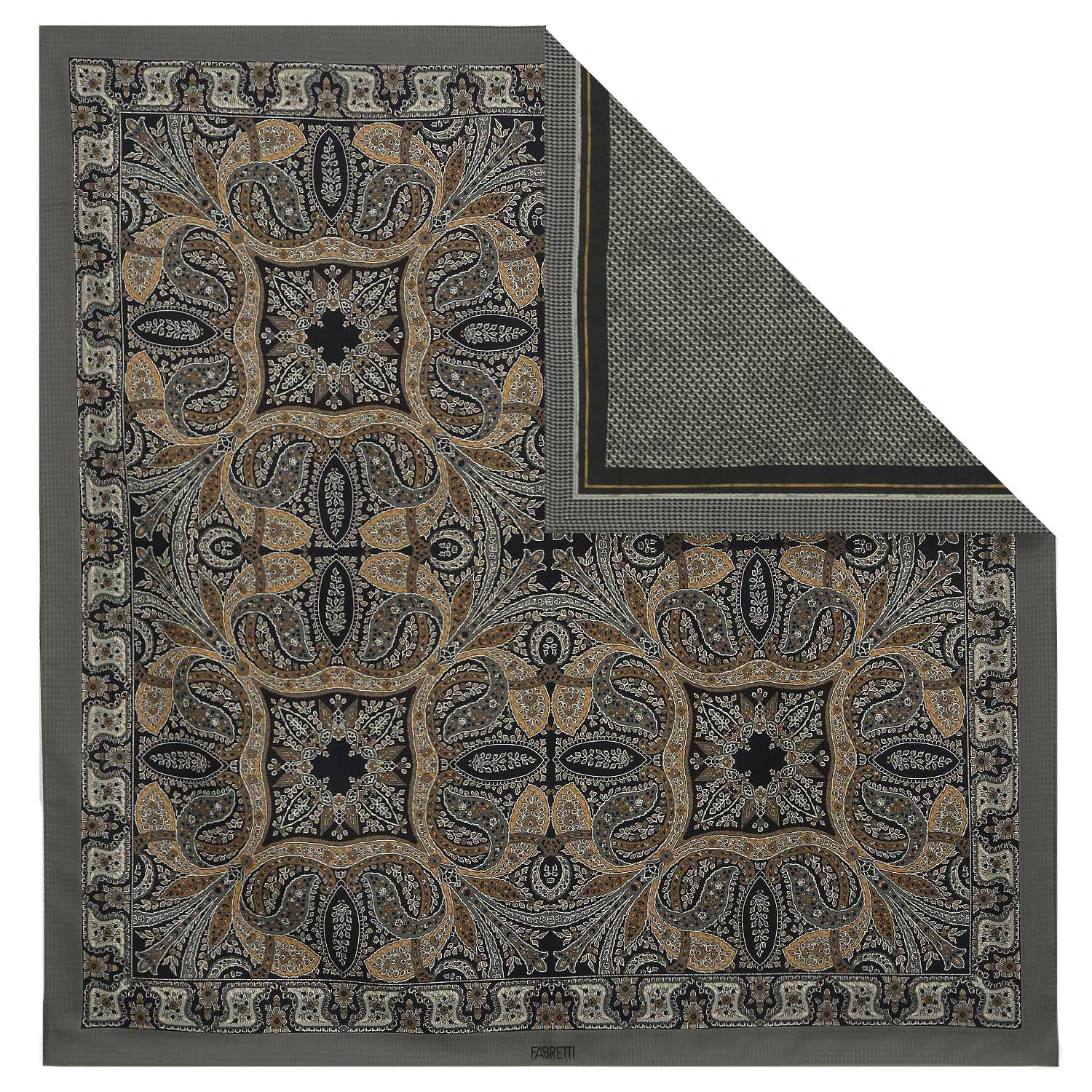 Элегантный платок итальянского бренда FABRETTI из легкого искусственного шелка с классическим растительным узором «пейсли» выполнен в благородной серо-зеленой гамме с элементами черного, бежевого и охряного тонов. Изнаночная сторона декорирована классическим геометрическим узором.
