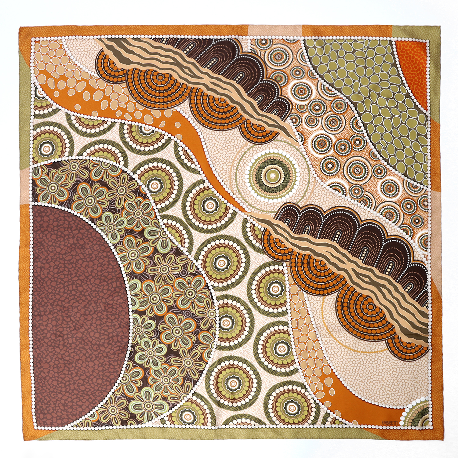 Классический женский платок итальянского бренда FABRETTI из натурального шелка с интересным абстрактным узором, сложенным из горошин разного размера, цвета и формы в натуральных зеленых, медно-коричневых и бежевых тонах.
