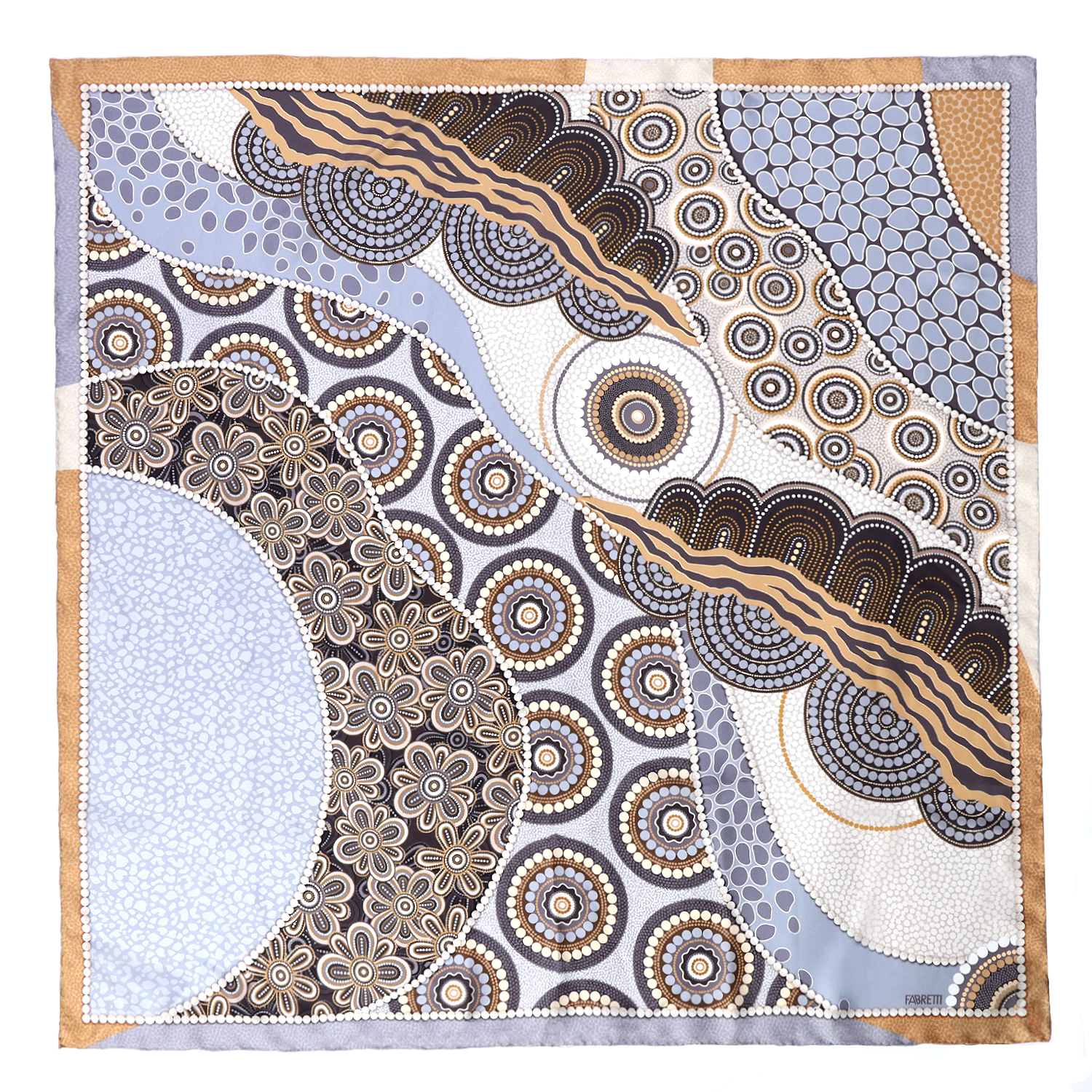 Классический женский платок итальянского бренда FABRETTI из натурального шелка с интересным абстрактным узором, сложенным из горошин разного размера, цвета и формы в серо-голубых и золотисто-бежевых тонах.