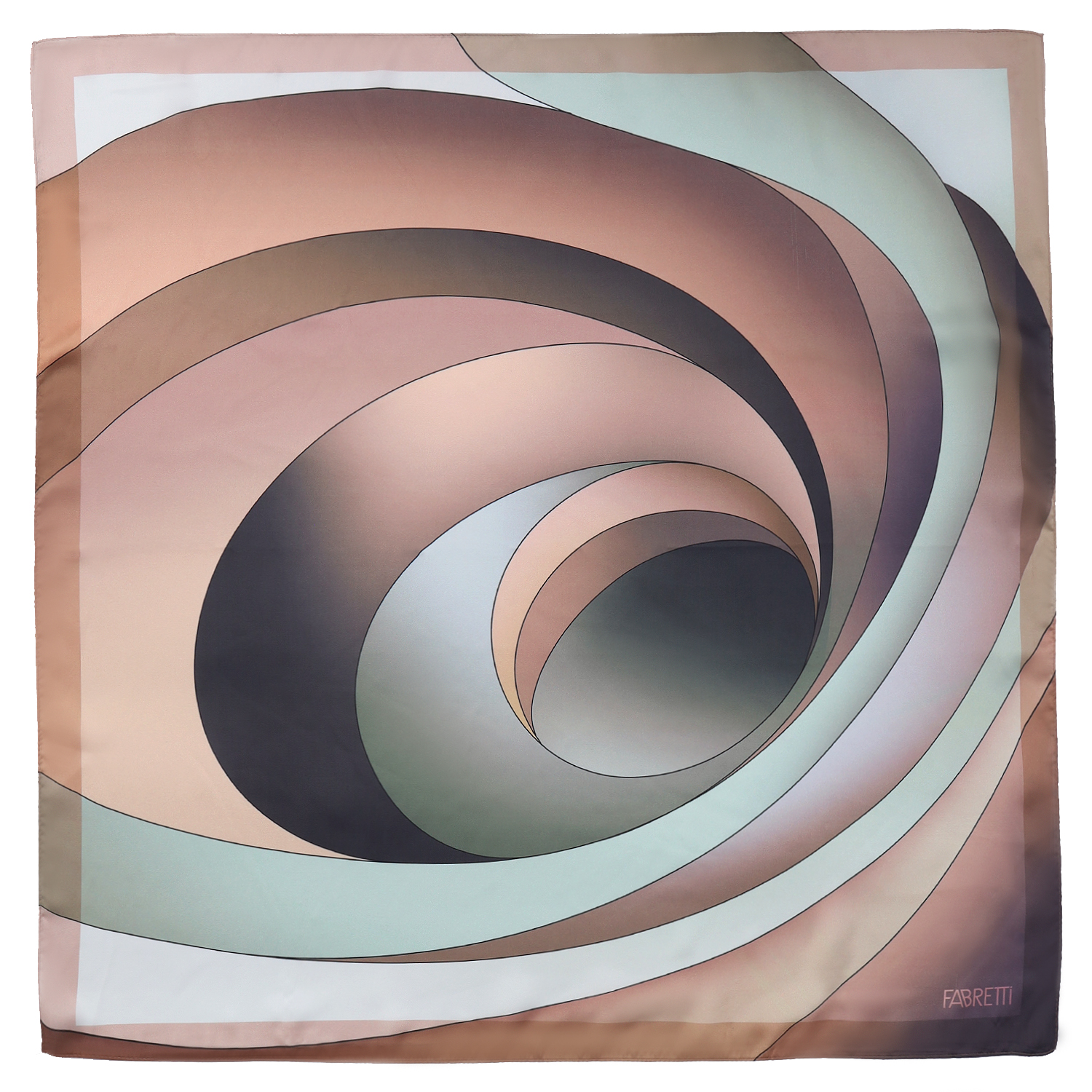 Оригинальный женский платок итальянского бренда FABRETTI из искусственного шелка в мягких оттенках зеленого, бежевого и коричневого тонов с абстрактным узором из линий.
