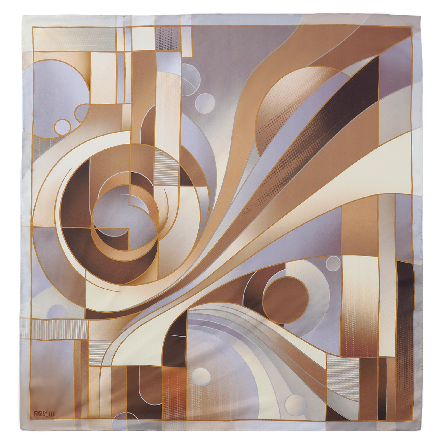 Великолепный женский платок итальянского бренда FABRETTI из натурального шелка с абстрактным геометрическим узором. Платок смотрится эффектно и элегантно благодаря плавным линиям и градиентным переходам оттенков насыщенной коричневой и бежевой гаммы.