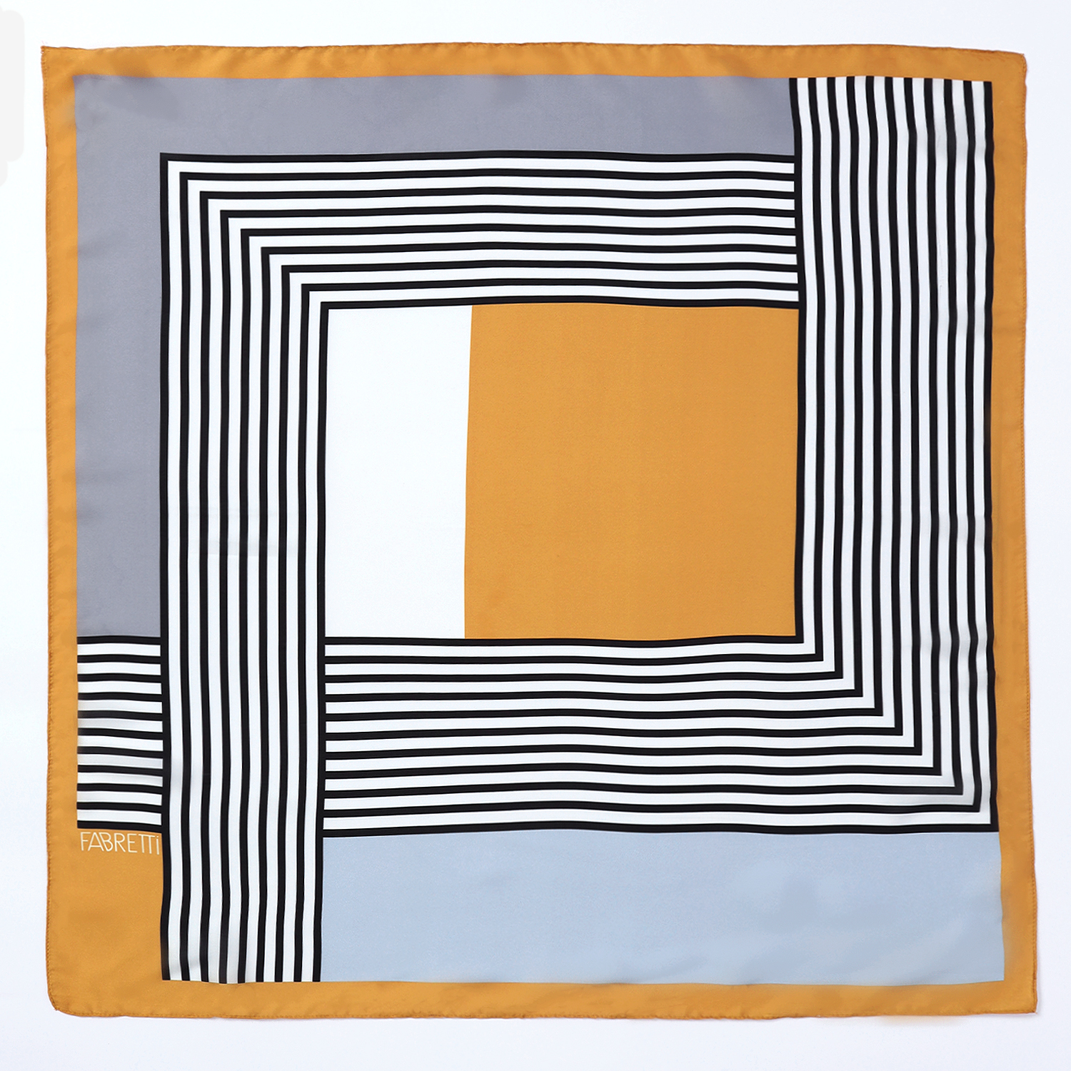 Лаконичный женский платок итальянского бренда FABRETTI из искусственного шелка со строгим геометрическим узором из квадратов и линий в желтом тоне.