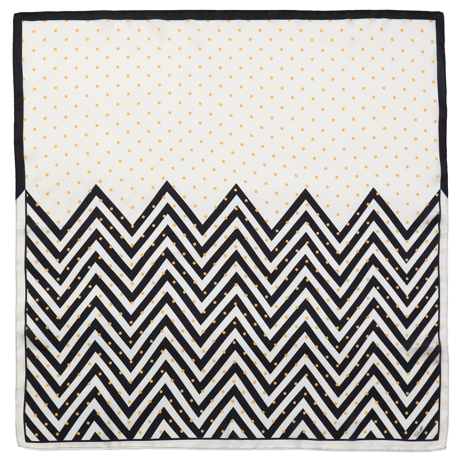 Платок с геометрией делает образ строже и официальнее. Монохромные «зигзаги» узора привлекают к себе внимание, но чтобы разбавить их строгость, дизайнеры FABRETTI добавили лаконичный узор из мелких золотистых горошин.
