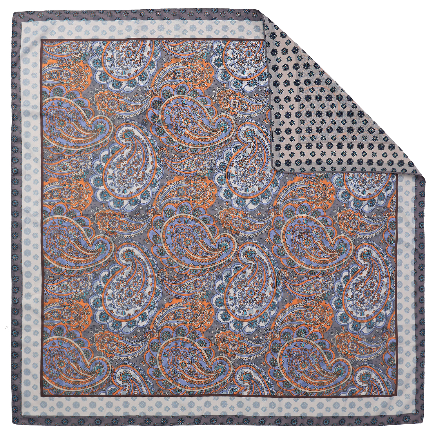 Оригинальный двусторонний женский платок итальянского бренда FABRETTI из искусственного шелка украшен классическим узором «пейсли» и другими восточными орнаментами в серо-коричневых тонах с оранжевыми и голубыми акцентами. Изнанка украшена цветочным узором.