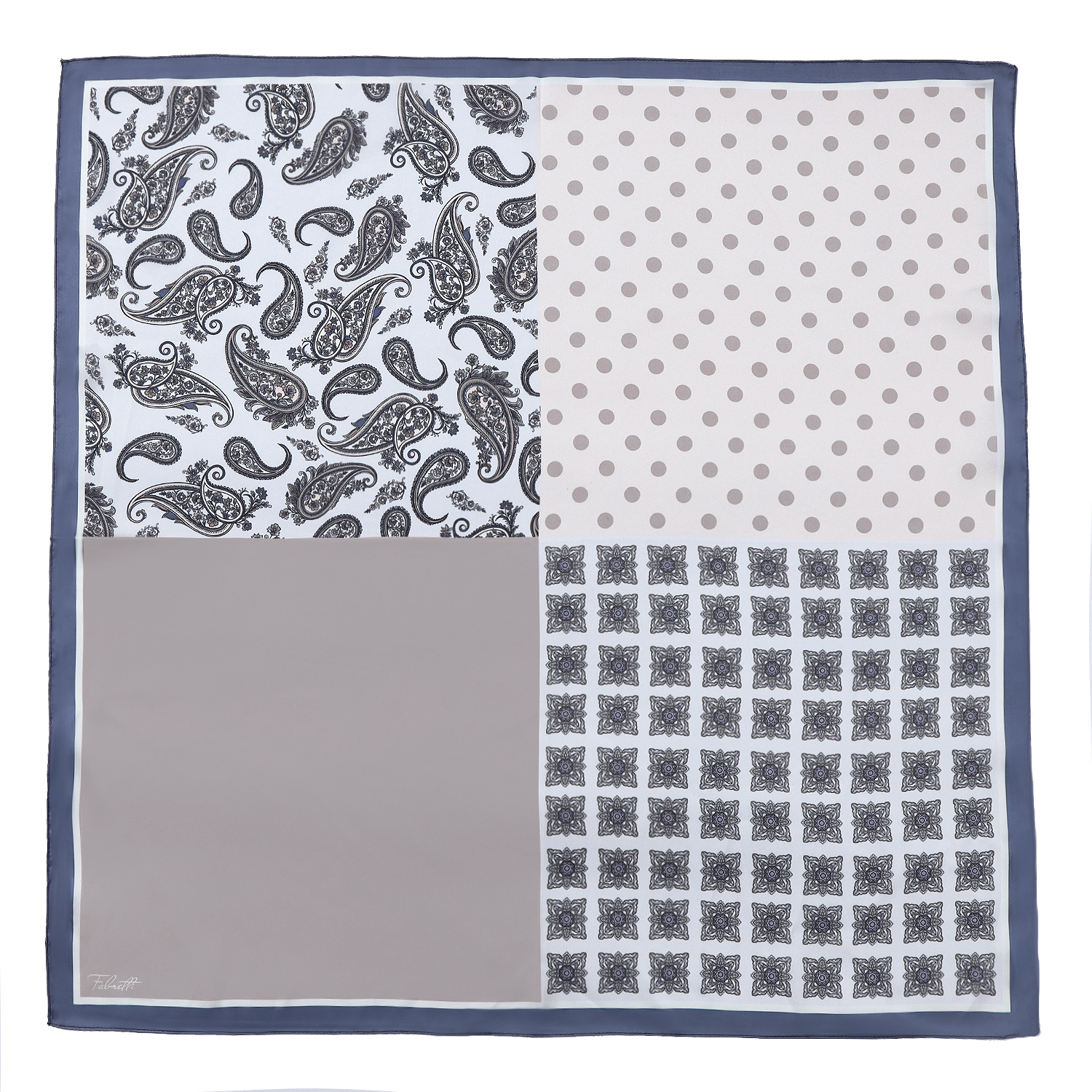 Оригинальный женский платок итальянского бренда FABRETTI из искусственного шелка в серых и синих тонах визуально разбит на 4 сегмента с различным декором. Он украшен такими элементами как классические узоры «пейсли» и горох, сложным восточным орнаментом, один сегмент однотонный. Это стилистическое решение позволяет носить один аксессуар в разных стилях и сочетать с различной одеждой и аксессуарами – от офисной до бохо.
